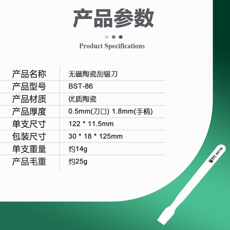 ? 产品名称: 无磁陶瓷刮刀? 产品型号: BST-86? 产品类别: 刀具系列