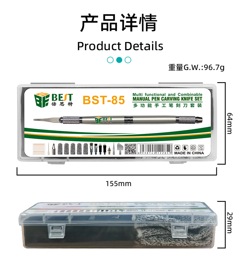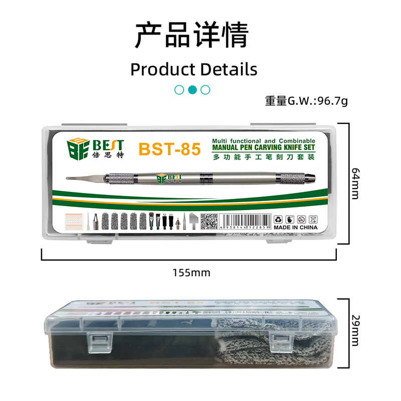 ? 产品名称: 多功能手工笔 刻刀套装? 产品型号: BST-85? 产品类别: 刮刀刻刀系列
