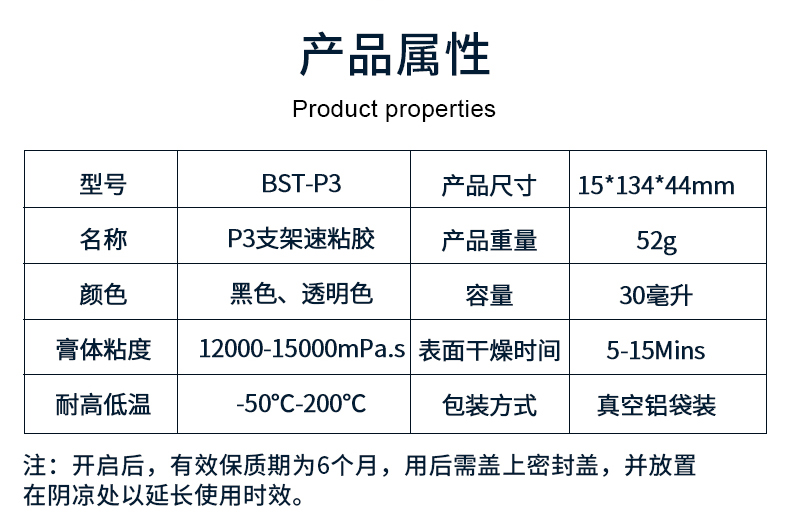 ? 产品名称: 支架速粘胶? 产品型号: BST-P3? 产品类别: 胶水胶纸系列