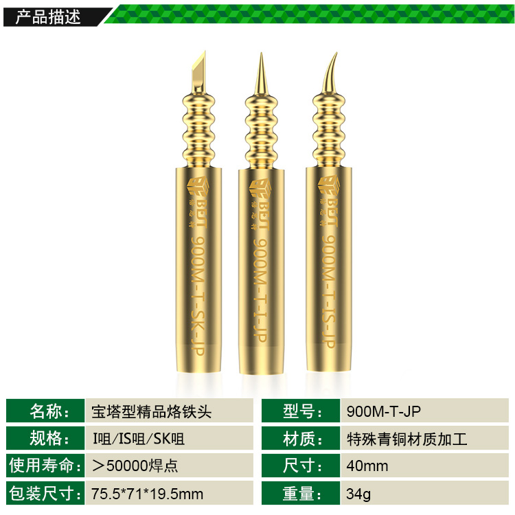 ? 产品名称: 宝塔型精品烙铁头? 产品型号: 900M-T-JP? 产品类别: 烙铁咀系列