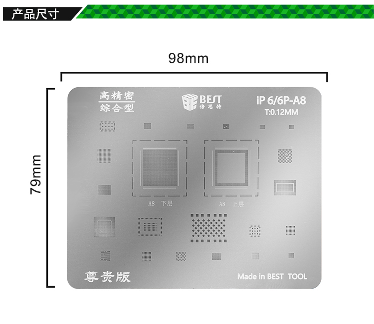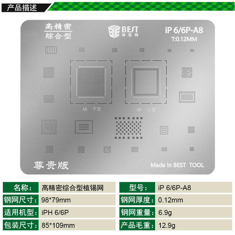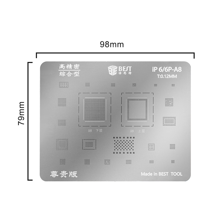 返回当前位置: 首页 / 产品中心 / iP 6/6P-A8 BGA植锡网 多用植锡方孔定位钢网 植锡卡(尊贵版)