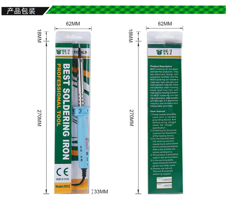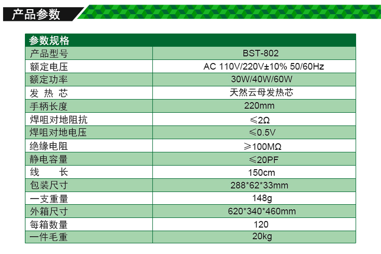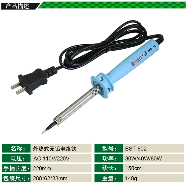 ? 产品名称: 外热式无铅电烙铁? 产品型号: BST-802? 产品类别: 电烙铁系列
