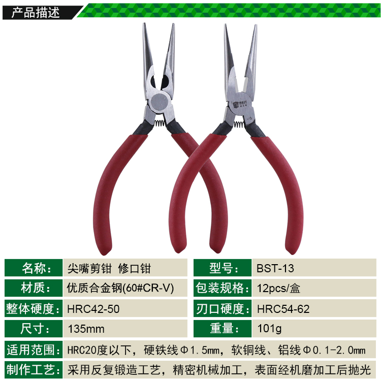 ? 产品名称: 尖嘴剪钳 尖咀钳 修口钳? 产品型号: BST-13? 产品类别: 钳子系列