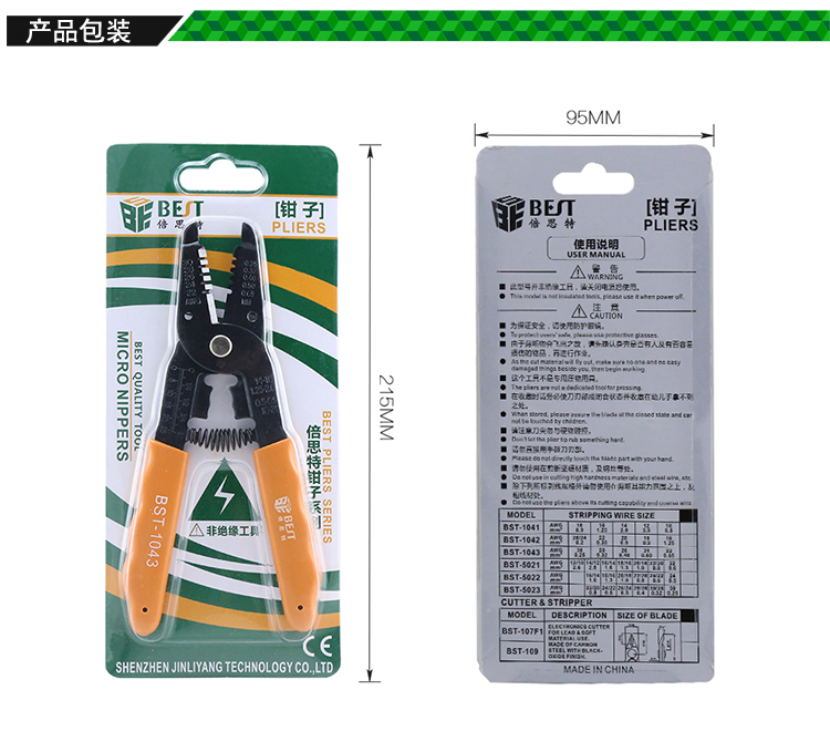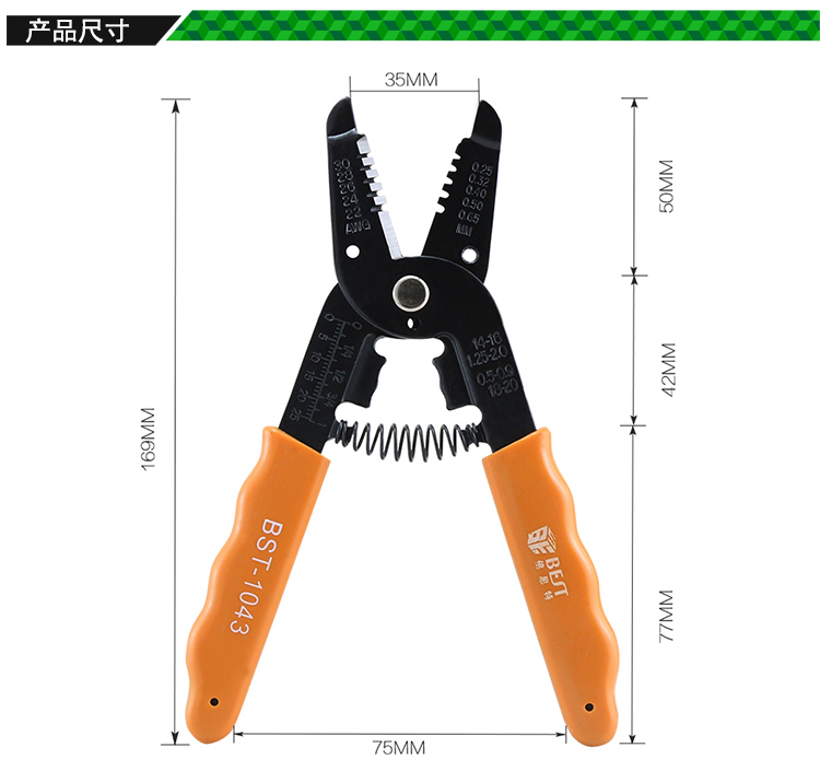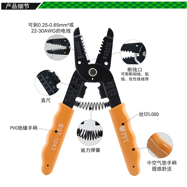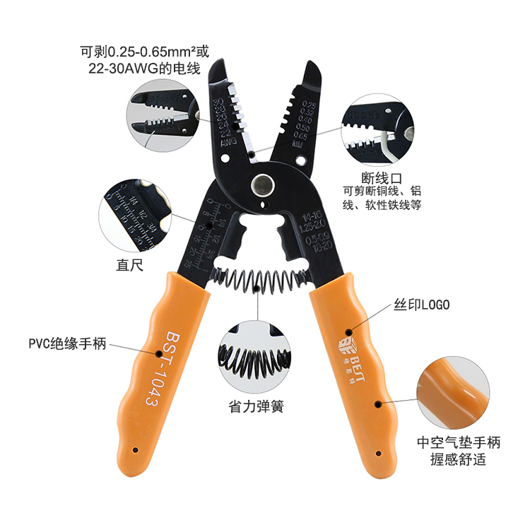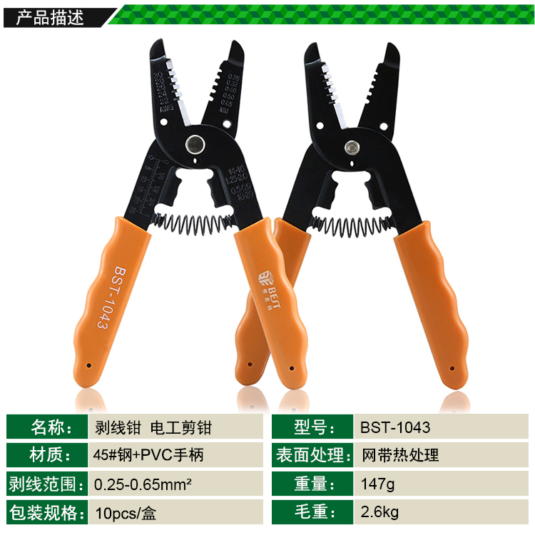 ? 产品名称: 剥线钳 电线钳 电工剪钳? 产品型号: BST-1043? 产品类别: 钳子系列