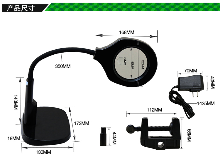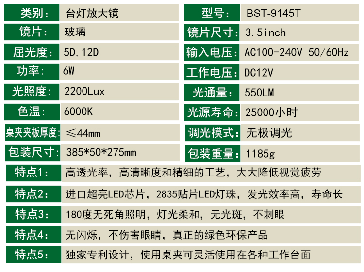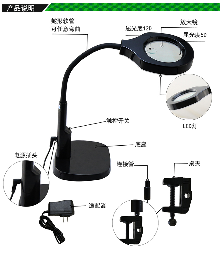 ? 产品名称: 黑色可调亮度LED放大镜台灯? 产品型号: BST-9145T? 产品类别: 放大镜台灯系列