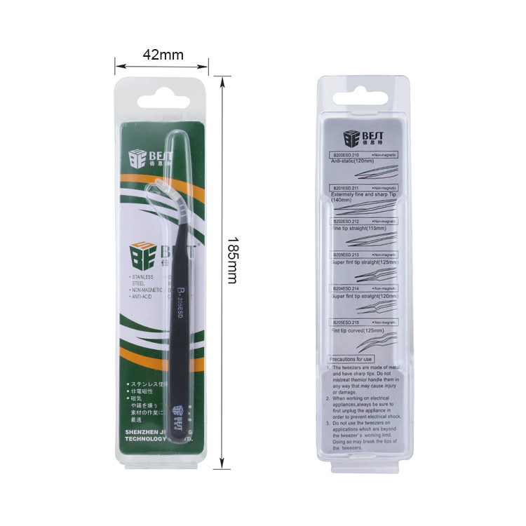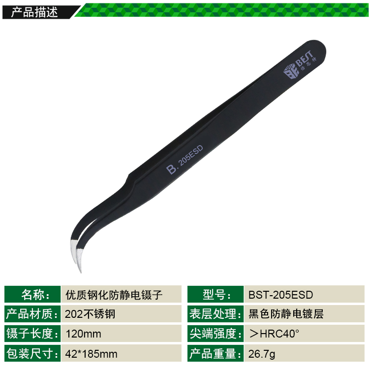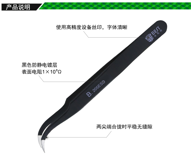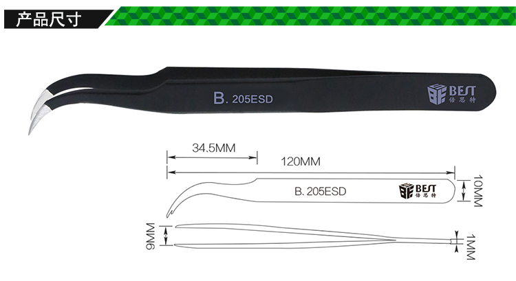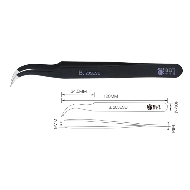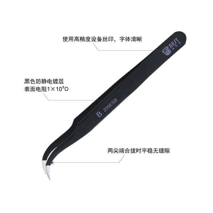 ? 产品名称: 优质钢化防静电镊子? 产品型号: BST-205ESD? 产品类别: 镊子系列