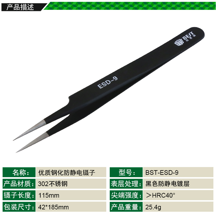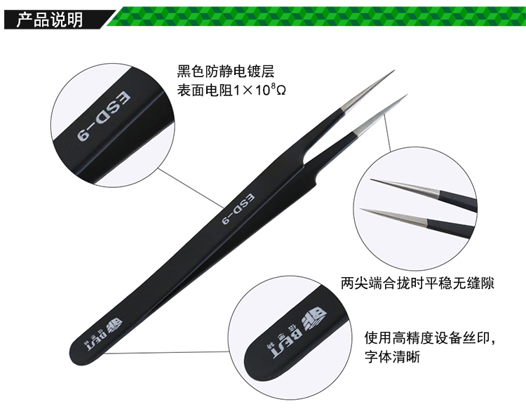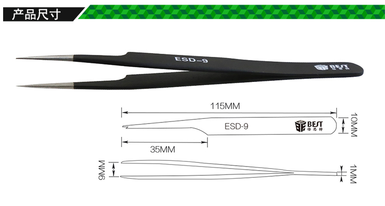 ? 产品名称: 优质钢化高级防静电镊子? 产品型号: BST-ESD-9? 产品类别: 镊子系列