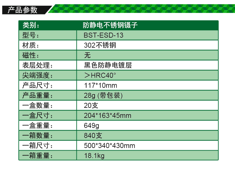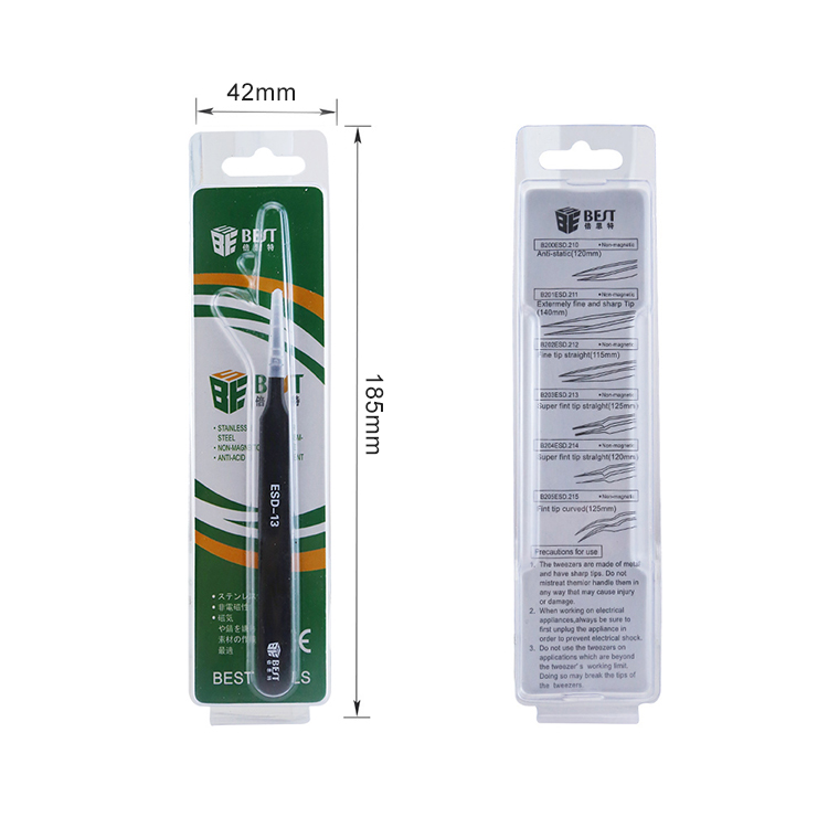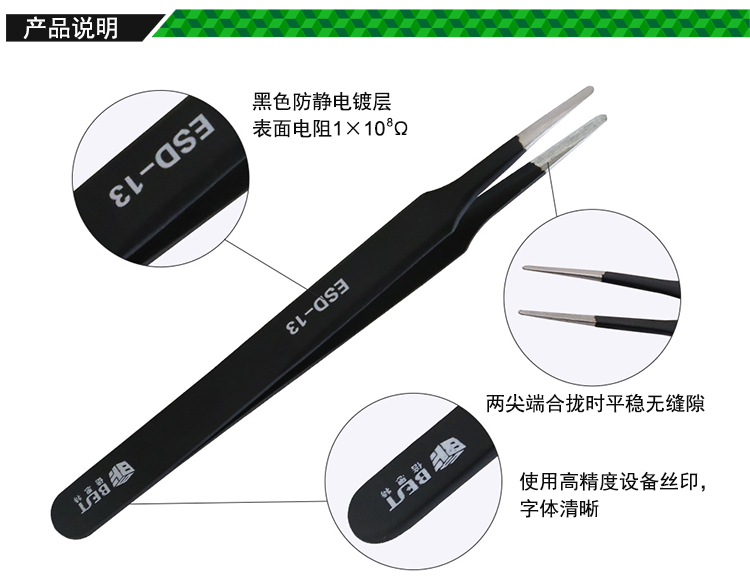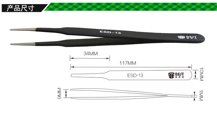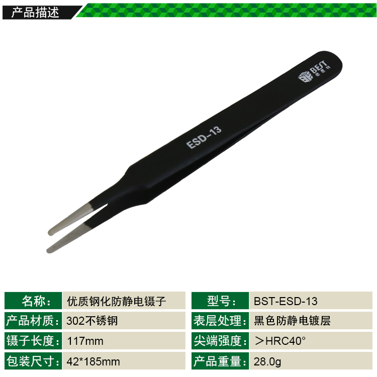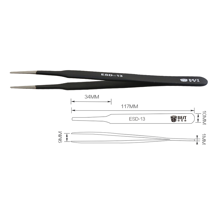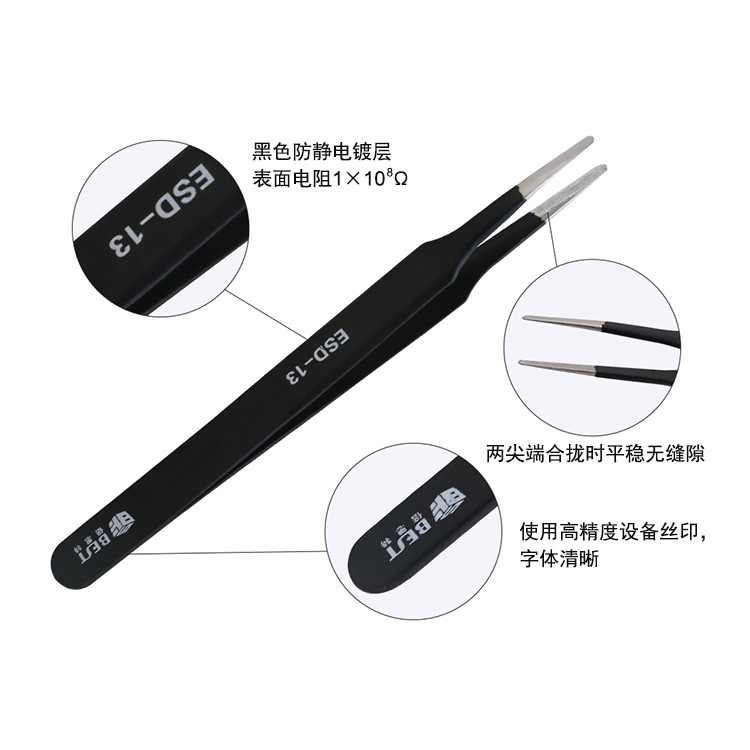 ? 产品名称: 优质钢化高级防静电镊子? 产品型号: BST-ESD-13? 产品类别: 镊子系列
