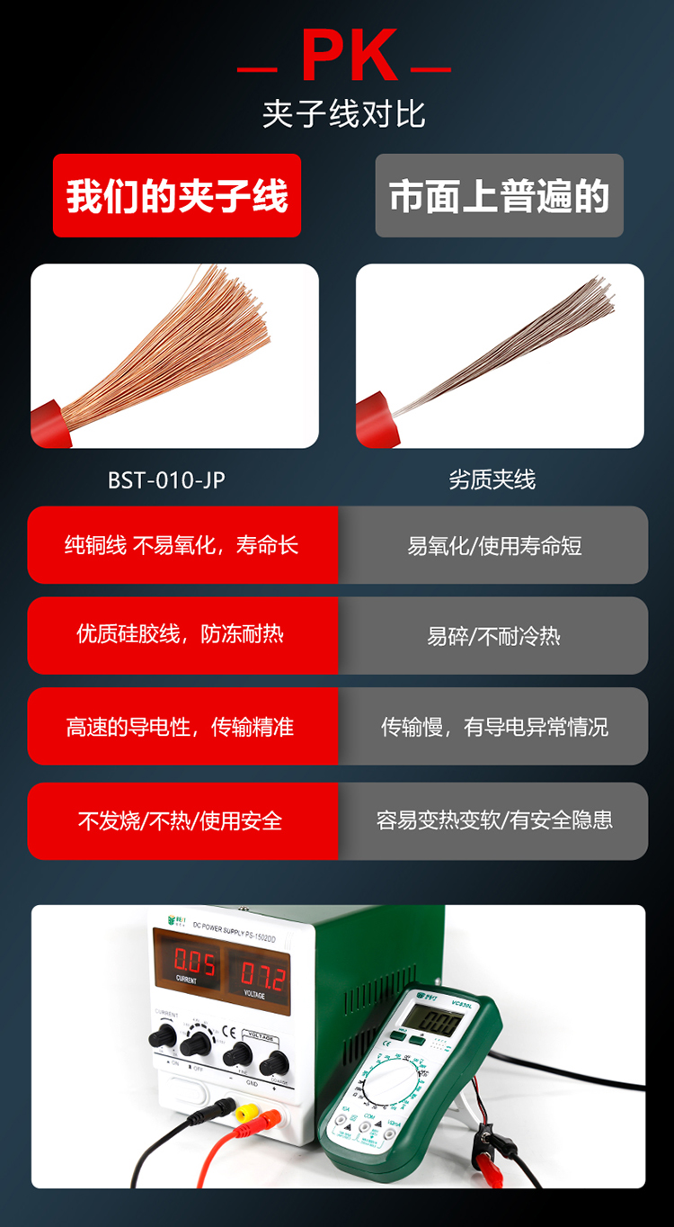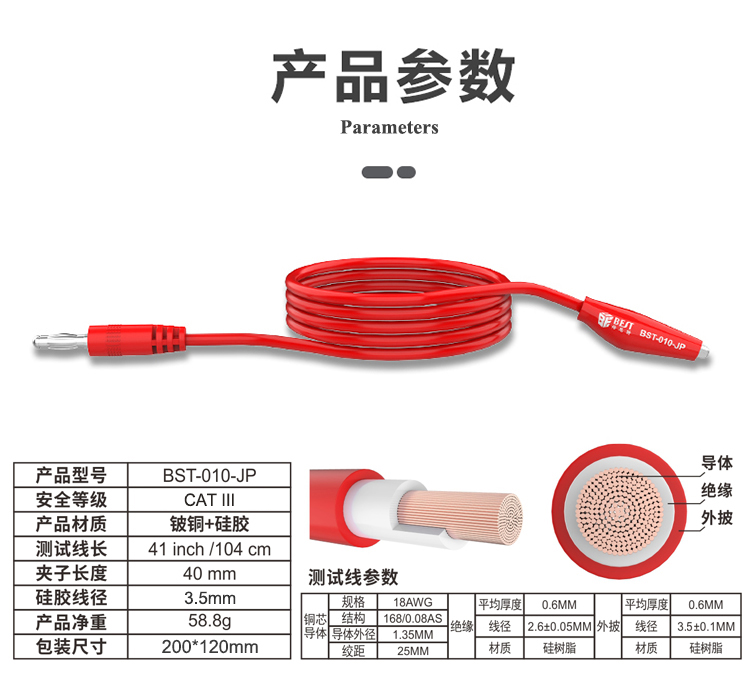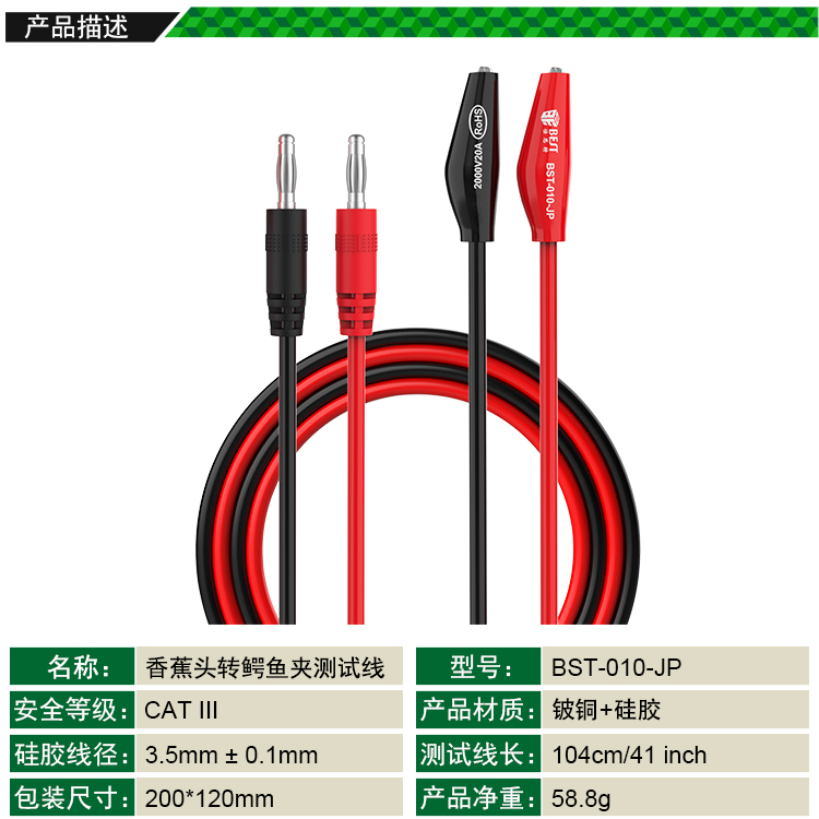 ? 产品名称: 超导传输夹子线? 产品型号: BST-010-JP? 产品类别: 表笔线系列