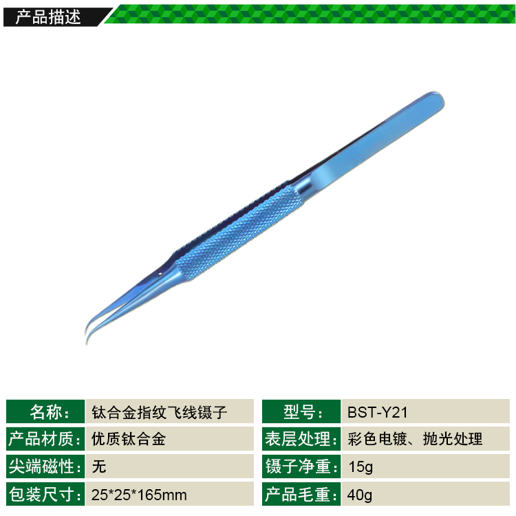 ? 产品名称: 钛合金细尖弯镊子? 产品型号: BST-Y21? 产品类别: 镊子系列