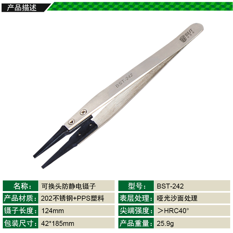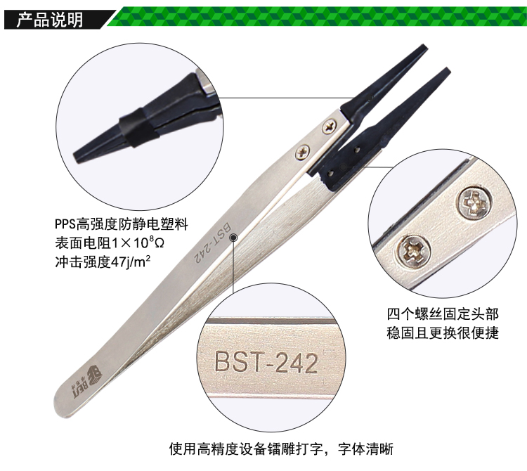? 产品名称: 防静电镊子可换头? 产品型号: BST-242? 产品类别: 镊子系列