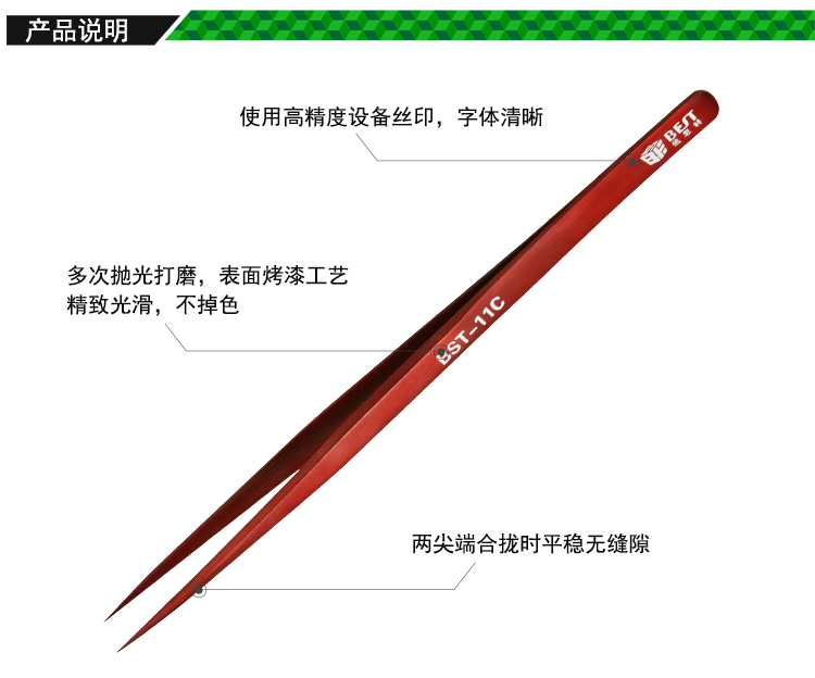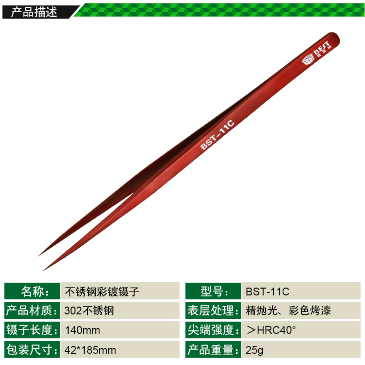 ? 产品名称: 彩色镊子 不锈钢彩镀镊子? 产品型号: BST-11C? 产品类别: 镊子系列