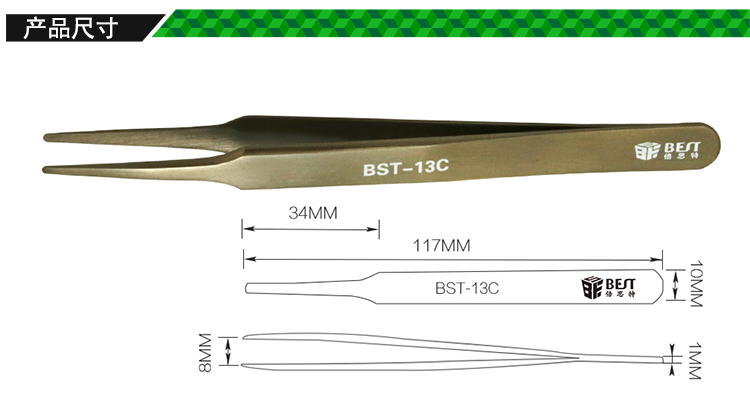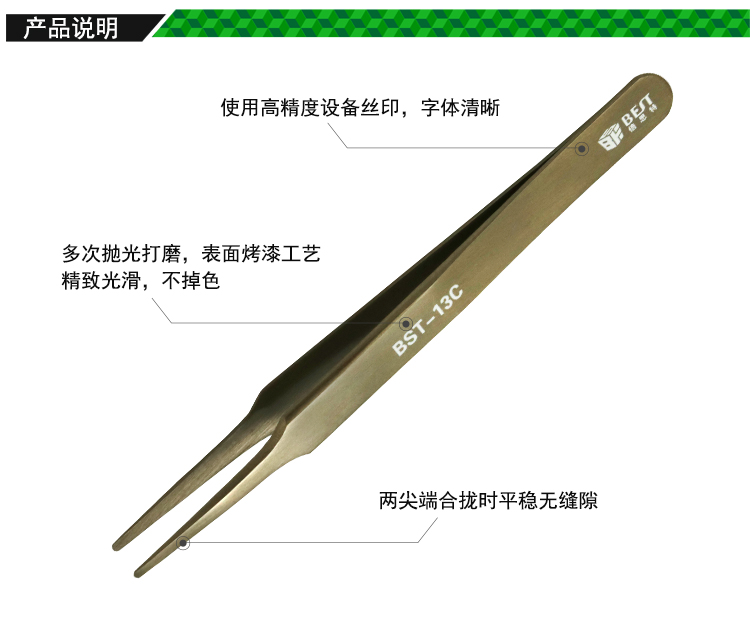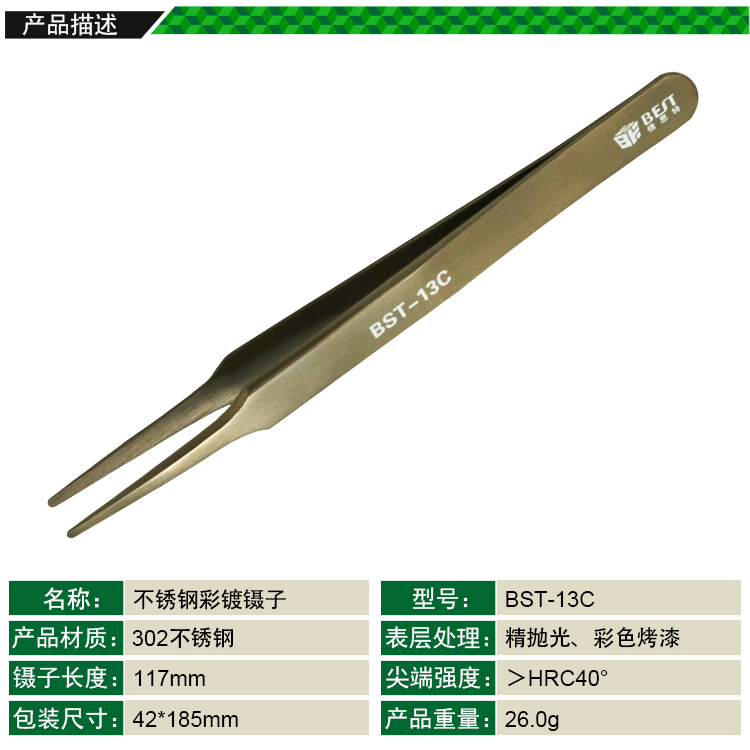 ? 产品名称: 彩色镊子 不锈钢彩镀镊子? 产品型号: BST-13C? 产品类别: 镊子系列