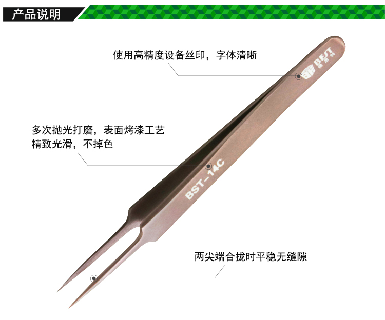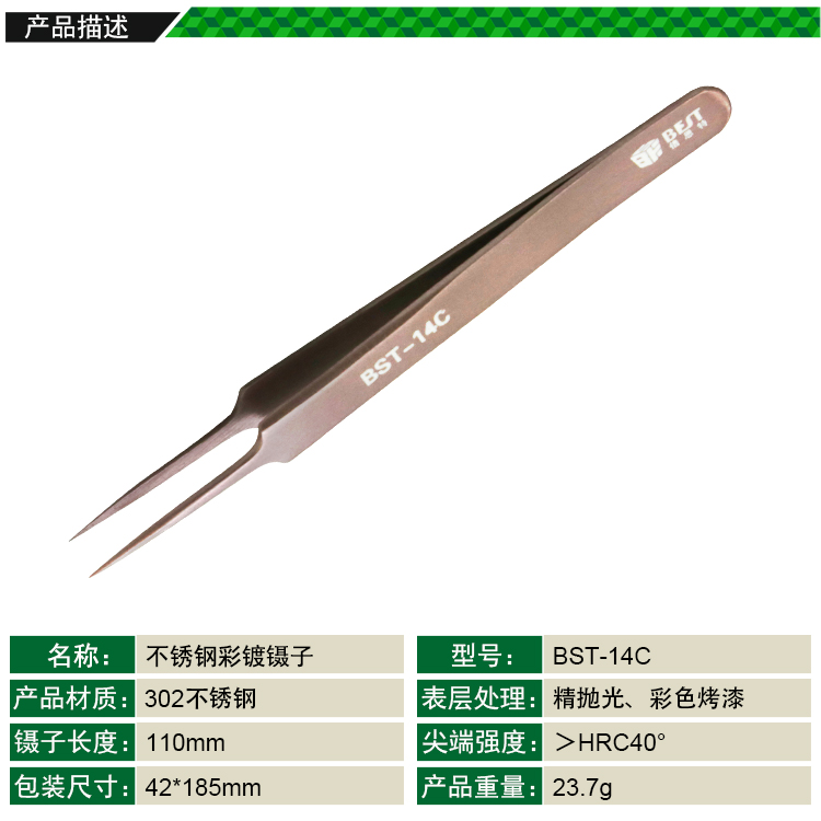? 产品名称: 彩色镊子 不锈钢彩镀镊子? 产品型号: BST-14C? 产品类别: 镊子系列