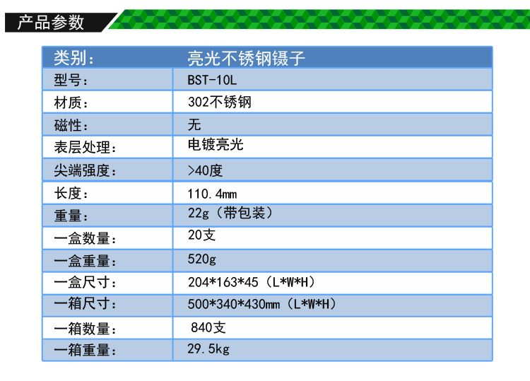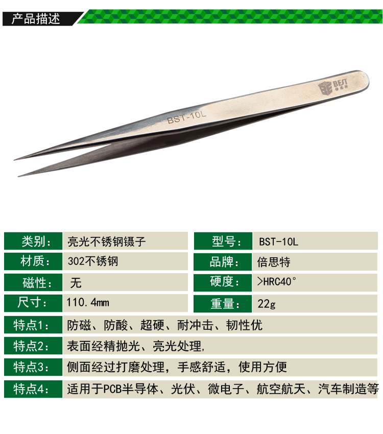 ? 产品名称: 亮光镊子 不锈钢镊子? 产品型号: BST-10L? 产品类别: 镊子系列