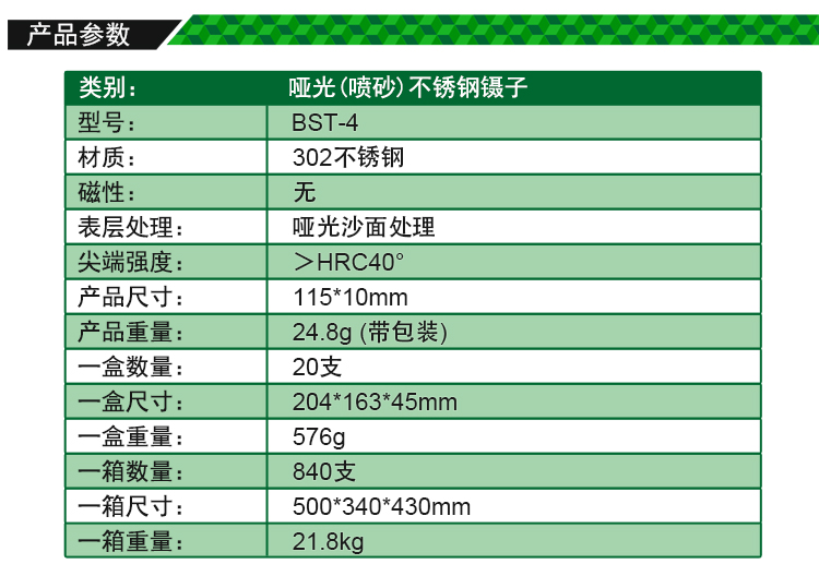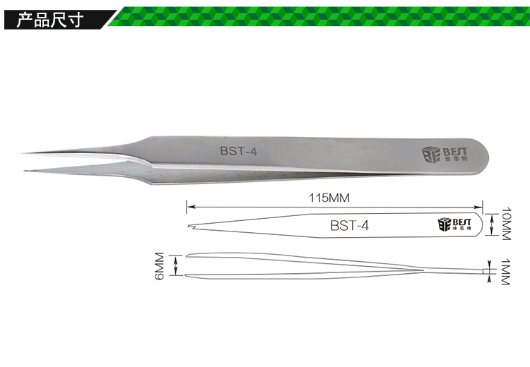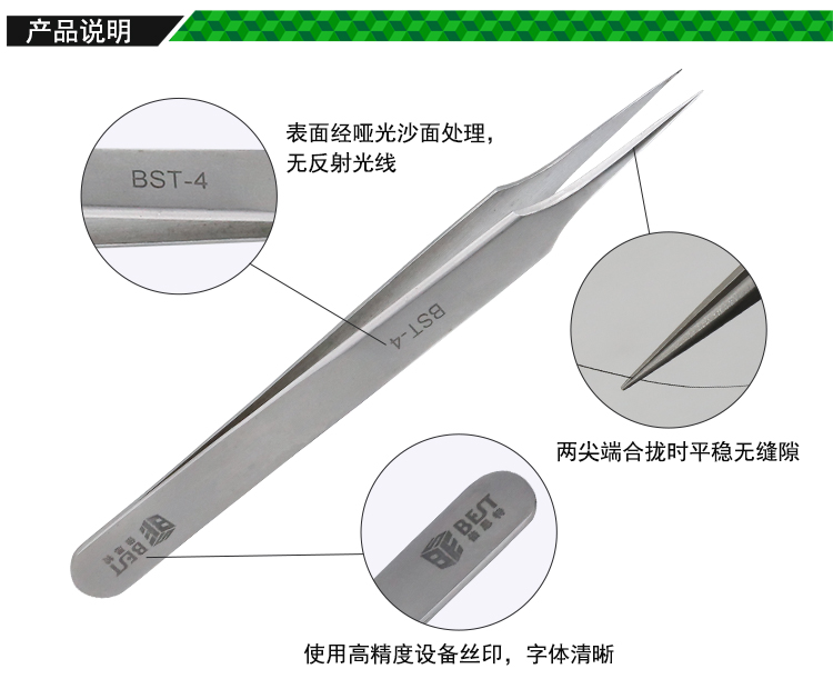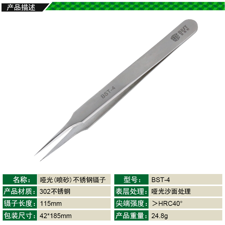 ? 产品名称: 亚光镊子 不锈钢镊子? 产品型号: BST-4? 产品类别: 镊子系列