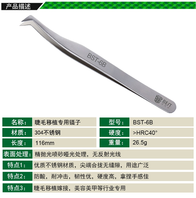 ? 产品名称: 睫毛移植专用镊子 美容镊子? 产品型号: BST-6B? 产品类别: 镊子系列