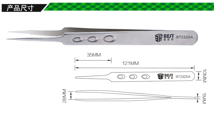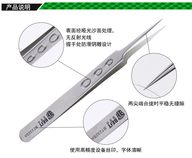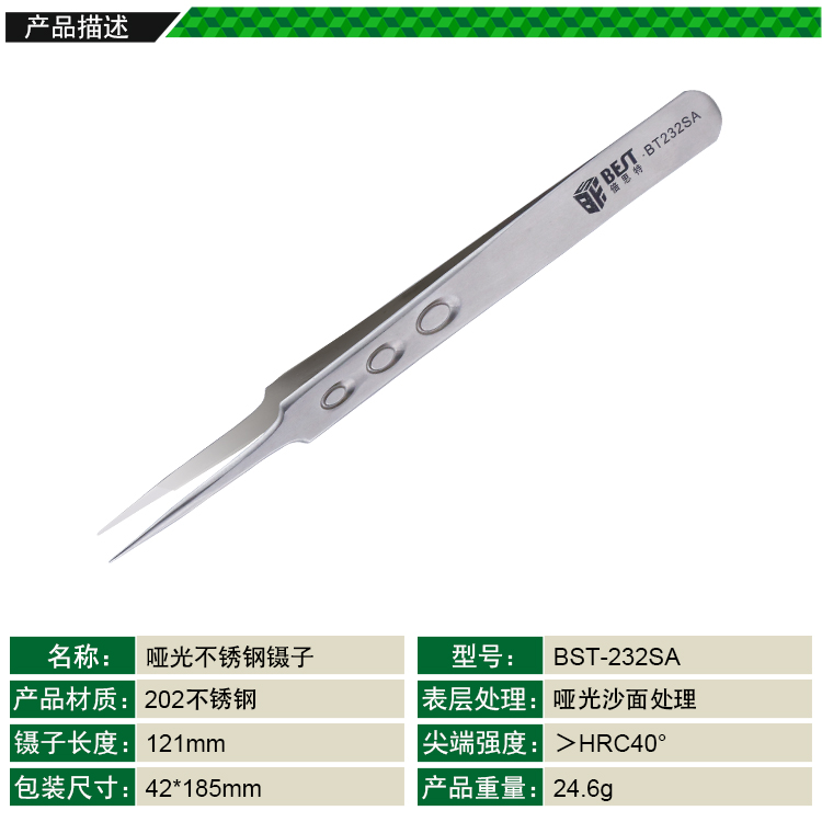 ? 产品名称: 亚光沙面镊子 不锈钢镊子? 产品型号: BST-232SA? 产品类别: 镊子系列