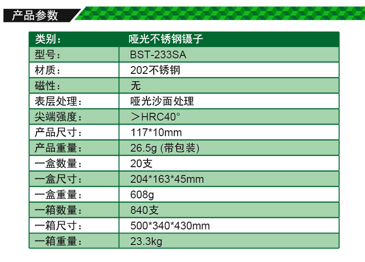 ? 产品名称: 亚光沙面镊子 不锈钢镊子? 产品型号: BST-233SA? 产品类别: 镊子系列