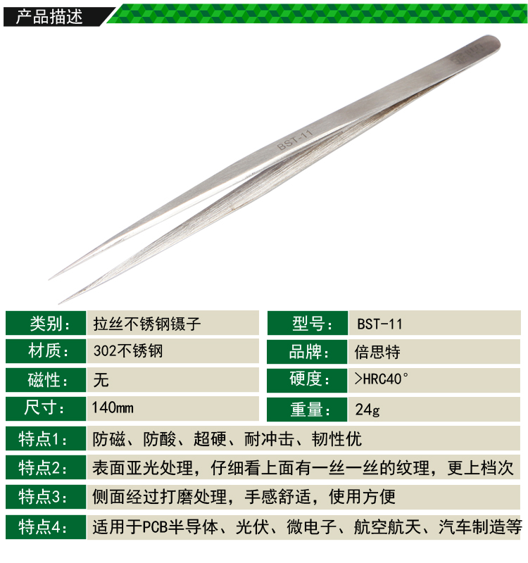? 产品名称: 金属拉丝镊子 不锈钢镊子? 产品型号: BST-11? 产品类别: 镊子系列