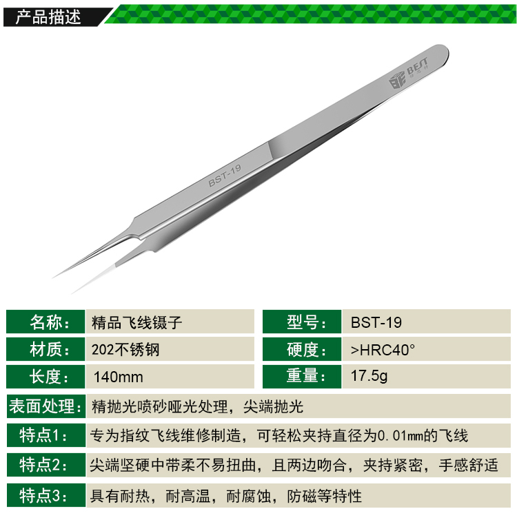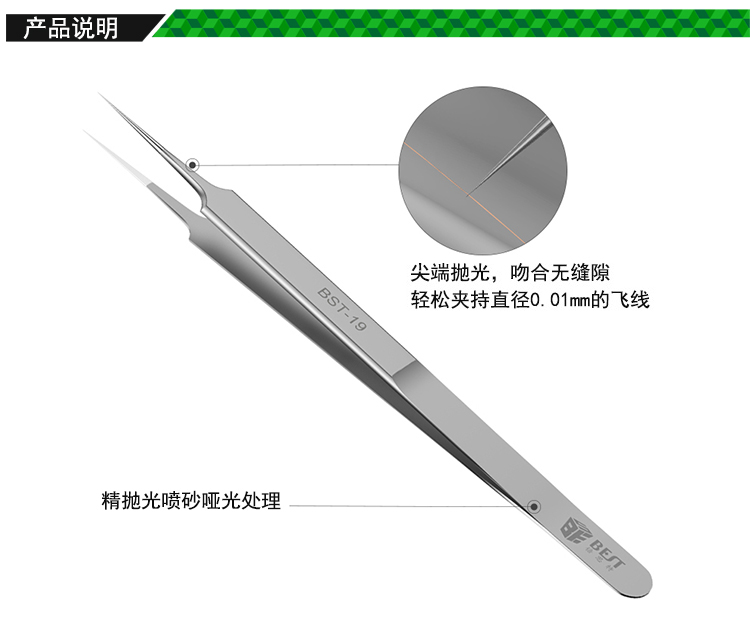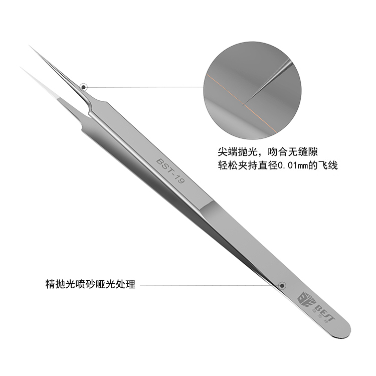 ? 产品名称: 精品飞线镊子 特尖镊子? 产品型号: BST-19? 产品类别: 镊子系列