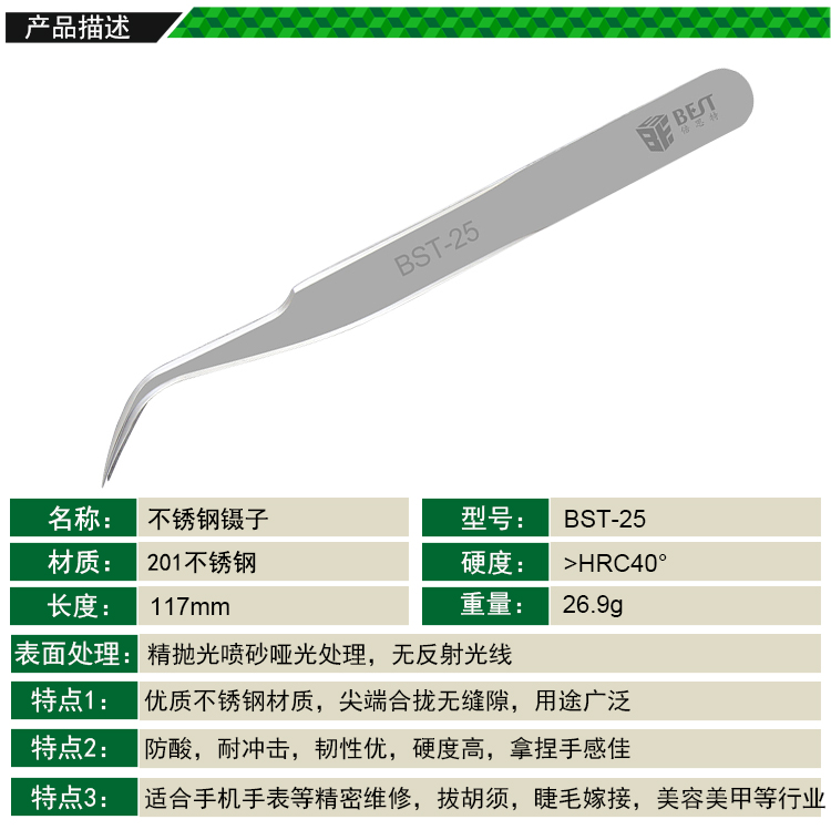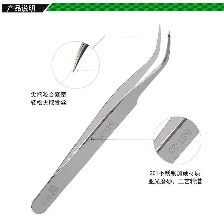 ? 产品名称: 亚光镊子 不锈钢镊子? 产品型号: BST-25? 产品类别: 镊子系列