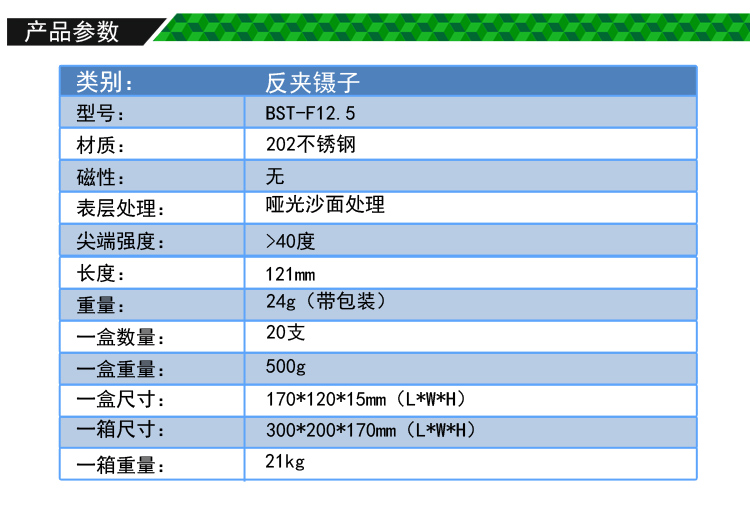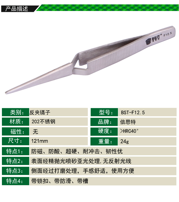 ? 产品名称: 防滑镊子 反夹镊子? 产品型号: BST-F12.5? 产品类别: 镊子系列