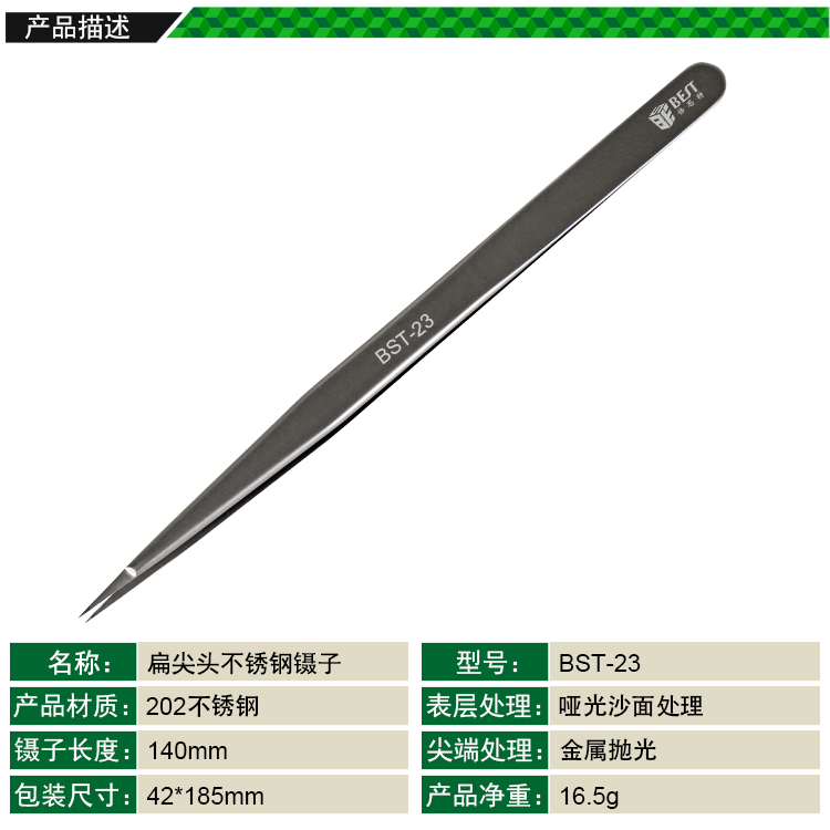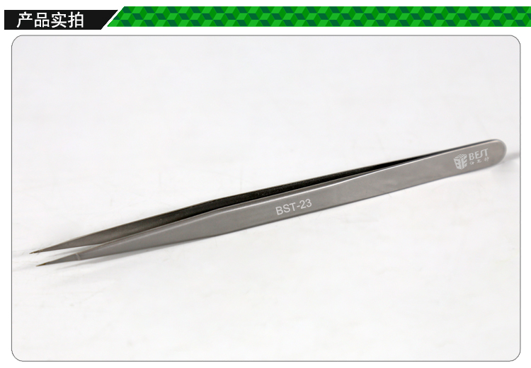 ? 产品名称: 扁尖头抛光直镊子? 产品型号: BST-23? 产品类别: 镊子系列