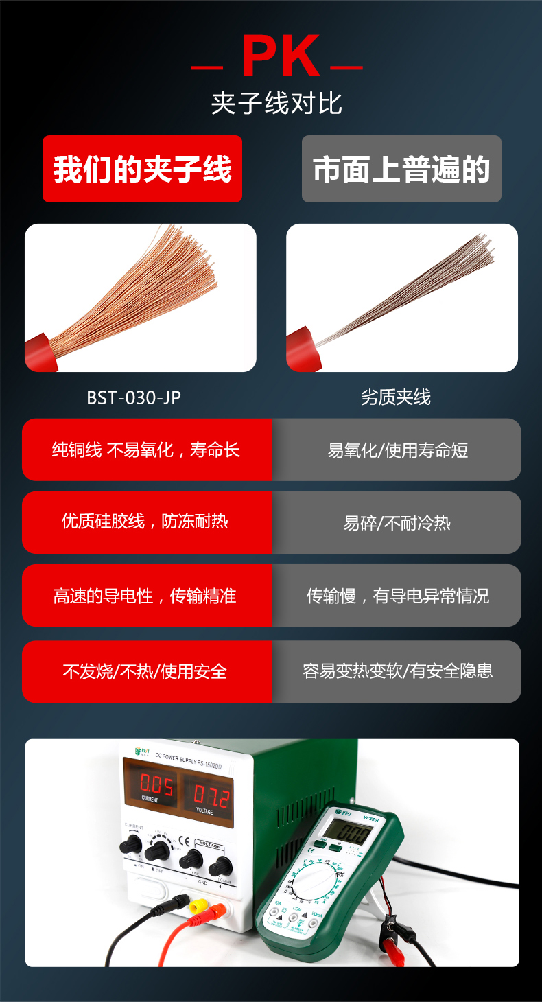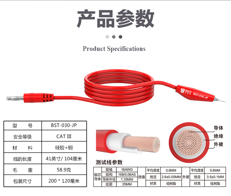 ? 产品名称: 超导传输夹子线? 产品型号: BST-030-JP? 产品类别: 表笔线系列