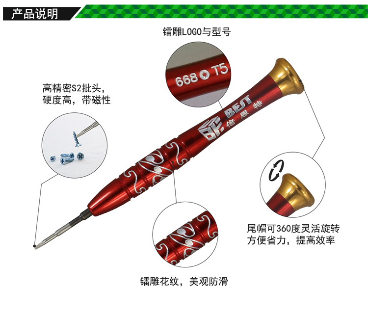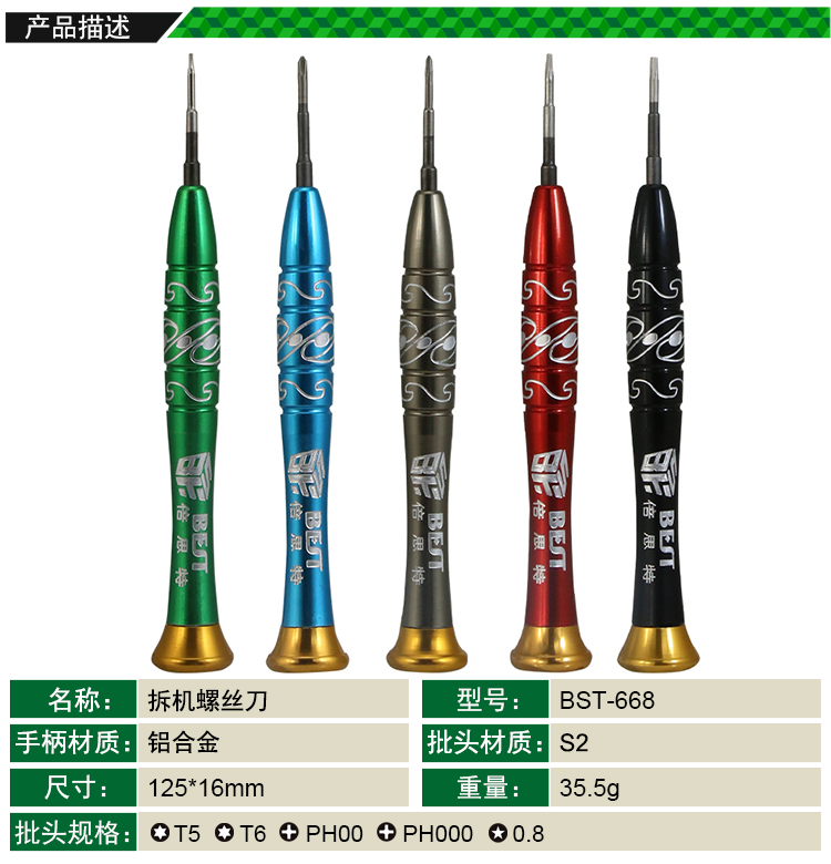 ? 产品名称: 拆机螺丝刀? 产品型号: BST-668? 产品类别: 螺丝批系列? 手柄材质: 铝合金? 批头材质: S2? 产品尺寸: 125*16mm? 产品重量: 35.5g