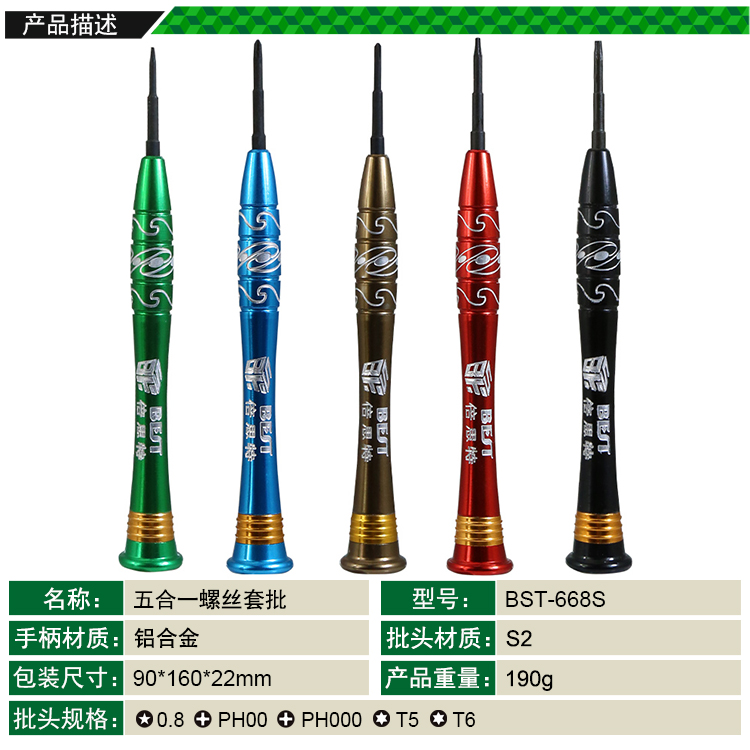 ? 产品名称: 五合一螺丝套批? 产品型号: BST-668S? 产品类别: 螺丝批系列? 手柄材质: 铝合金? 批头材质: S2? 包装尺寸: 90*160*22mm? 产品重量: 190g