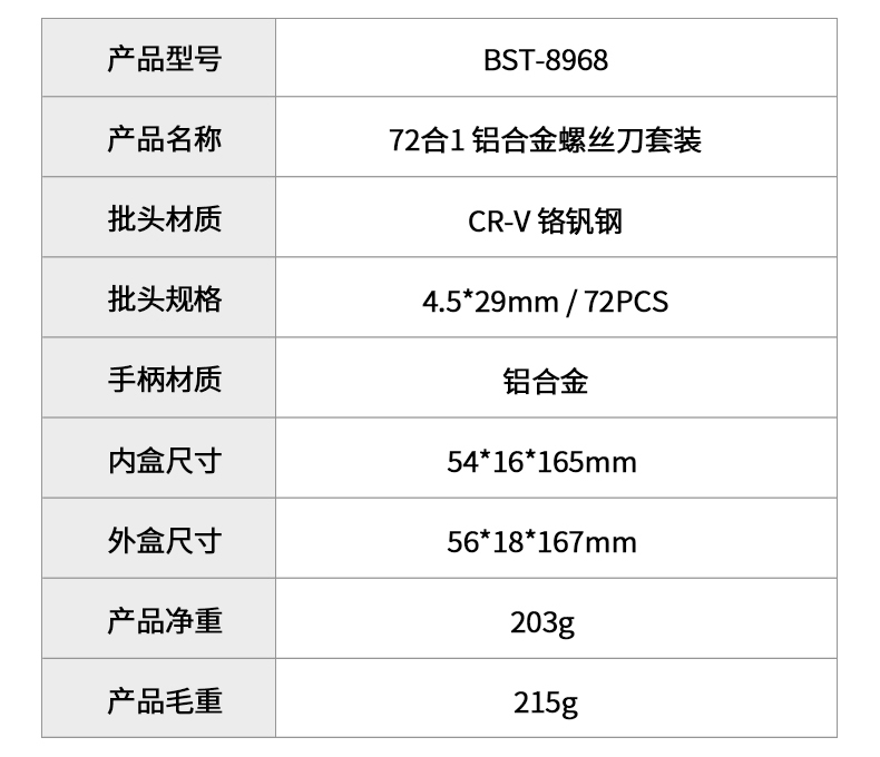 ? 产品名称: 螺丝刀套装72合1? 产品型号: BST-8968? 产品类别: 螺丝批系列