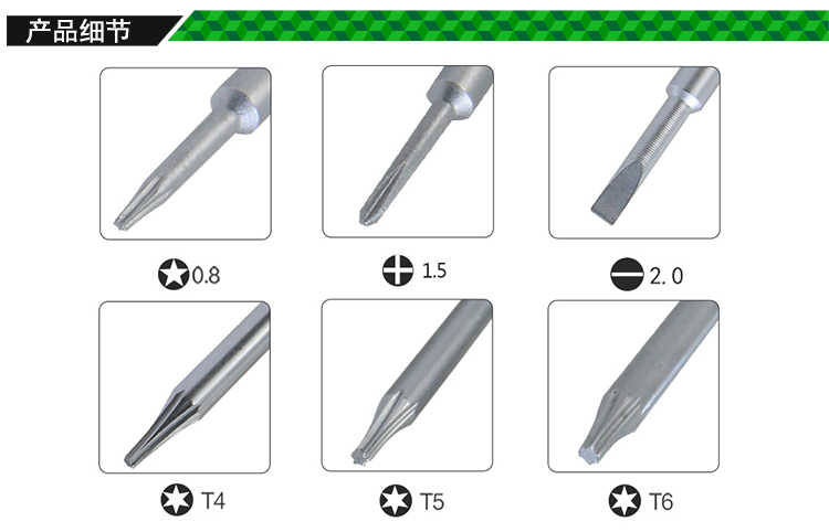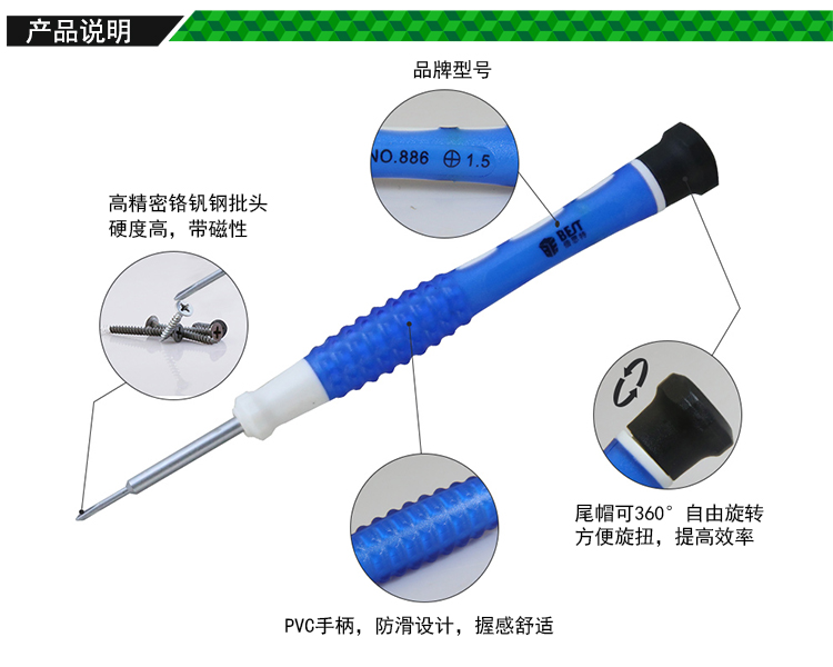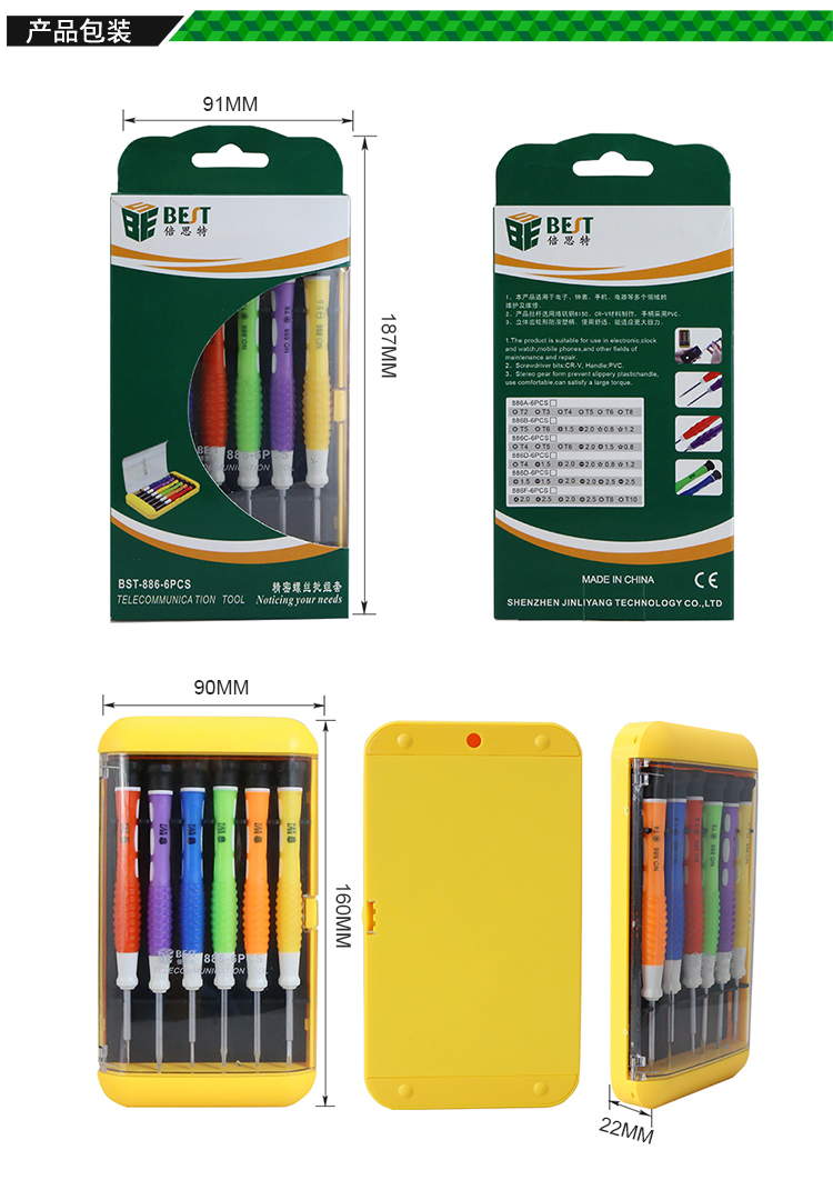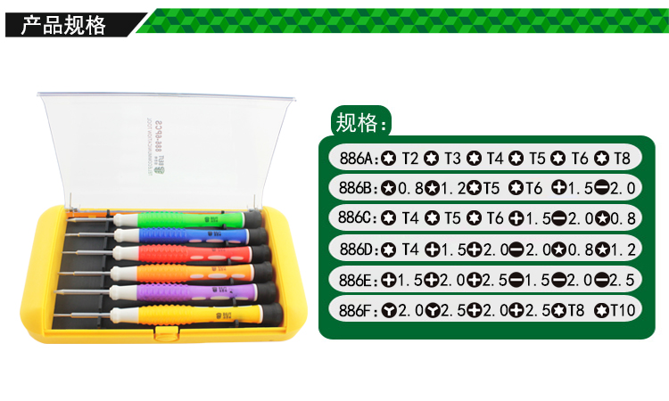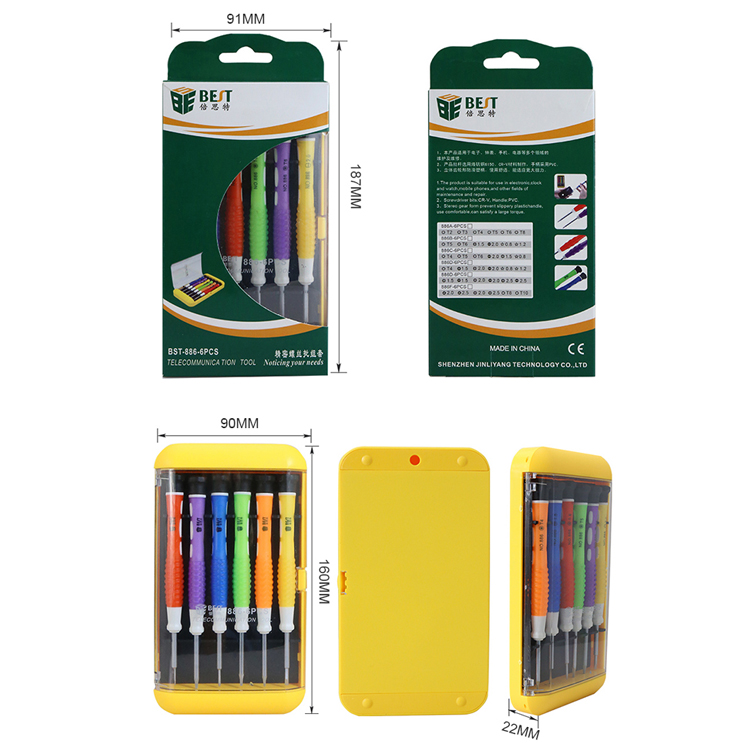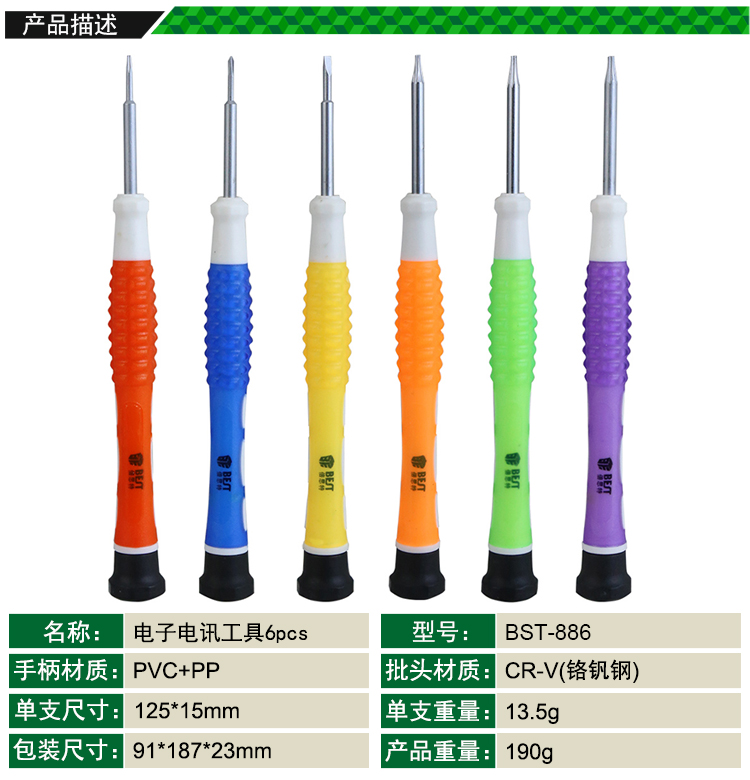 ? 产品名称: 电子电讯工具6pcs 螺丝套批 螺丝刀套装? 产品型号: BST-886? 产品类别: 螺丝批系列