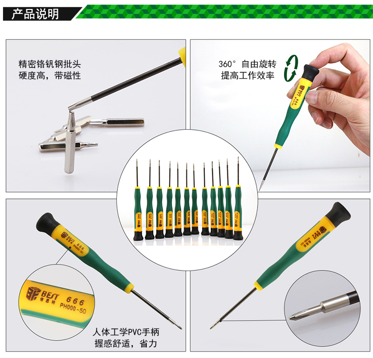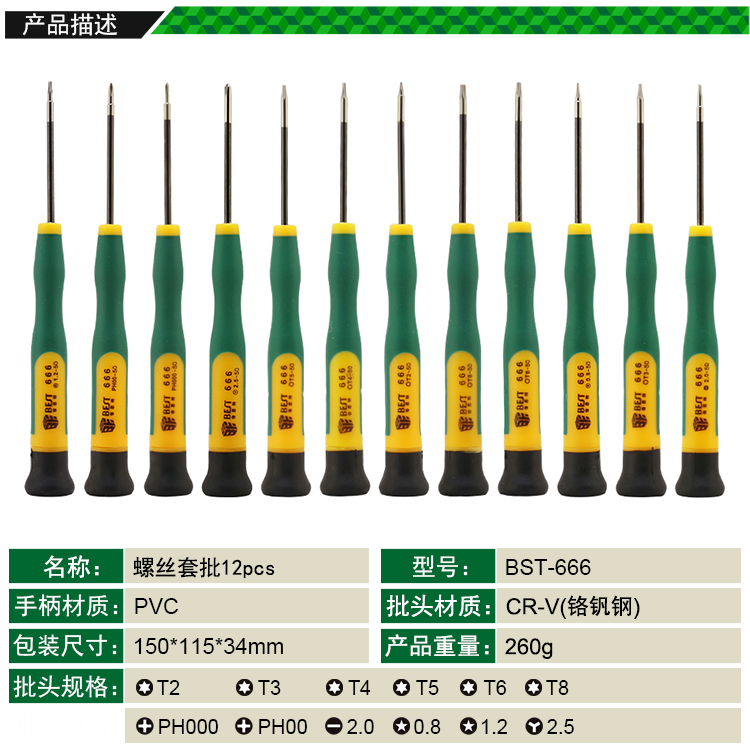 ? 产品名称: 螺丝套批12pcs 螺丝刀套装? 产品型号: BST-666? 产品类别: 螺丝批系列