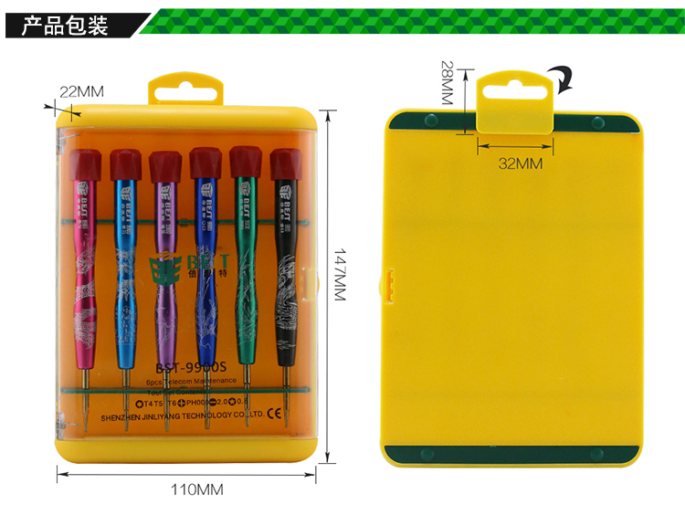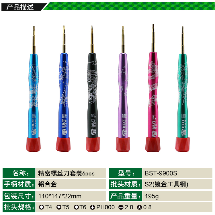 ? 产品名称: 电子电讯工具6pcs 螺丝套批 螺丝刀套装? 产品型号: BST-9900S? 产品类别: 螺丝批系列