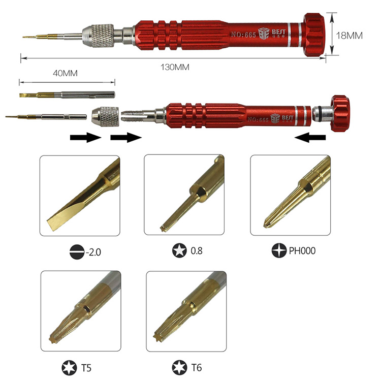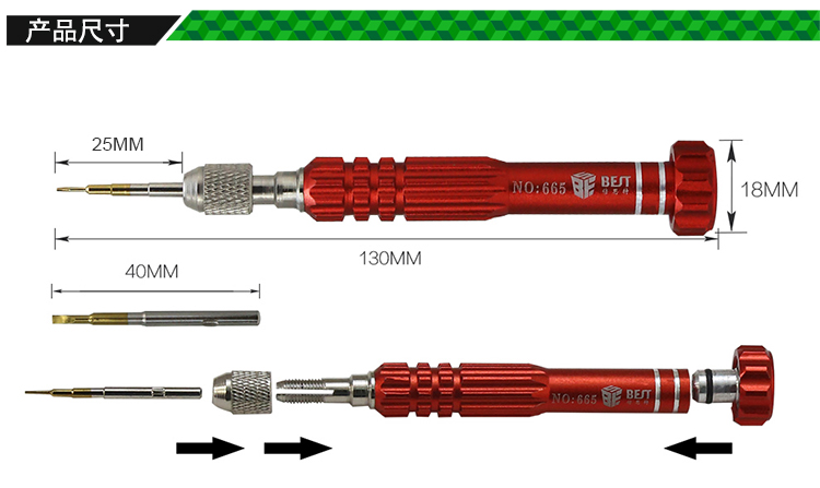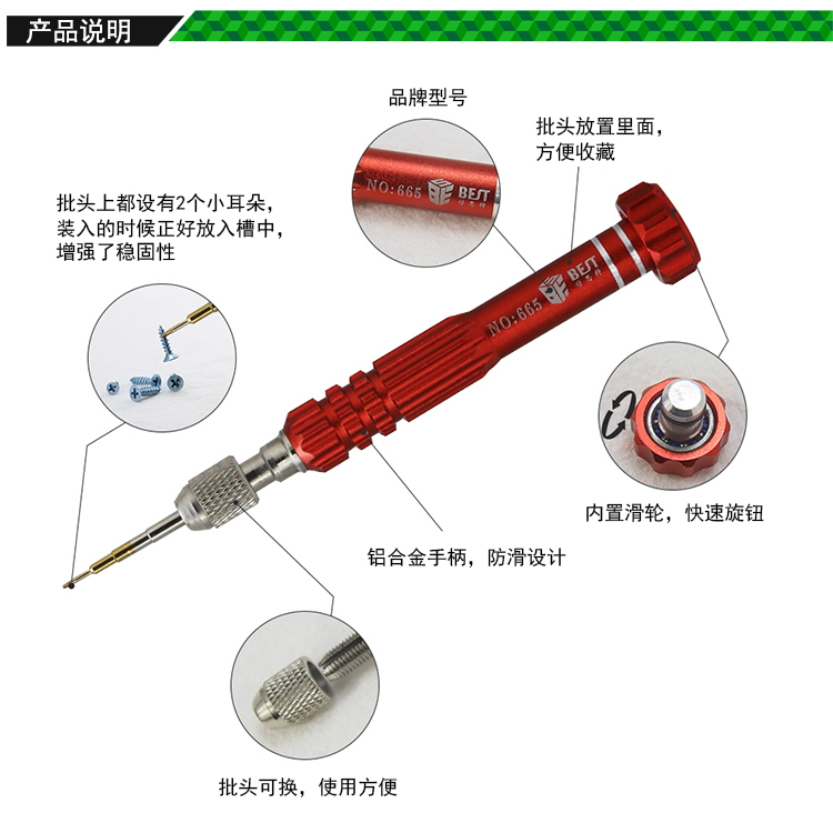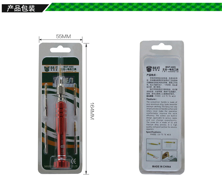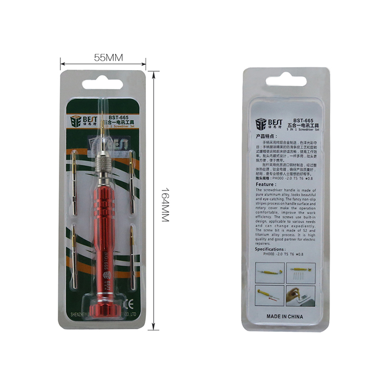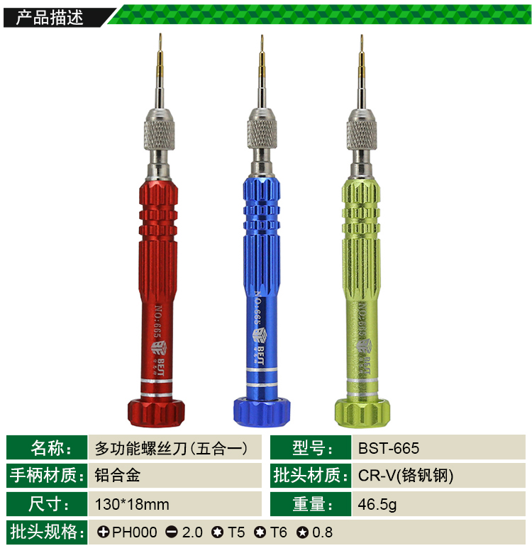 ? 产品名称: 五合一电讯工具 多功能螺丝批? 产品型号: BST-665? 产品类别: 螺丝批系列? 手柄材质: 铝合金? 批头材质: CR-V(铬钒钢)? 产品尺寸: 130*18mm? 产品重量: 46.5g