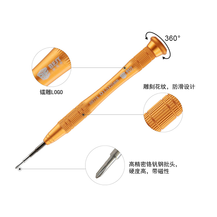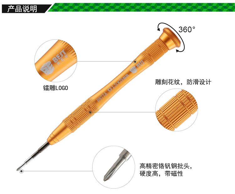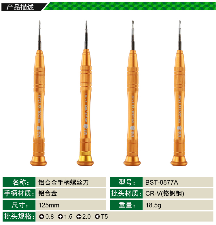 ? 产品名称: 金色铝合金手柄精密螺丝刀? 产品型号: BST-8877A? 产品类别: 螺丝批系列