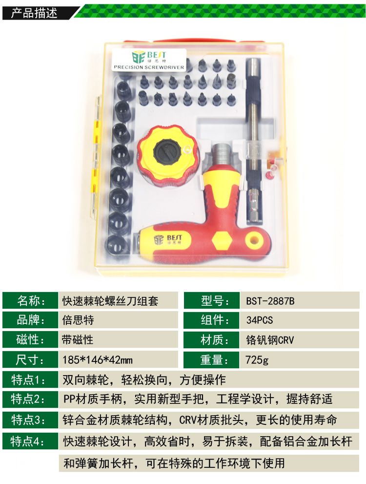 ? 产品名称: 34件套 快速棘轮螺丝刀组套? 产品型号: BST-2887B? 产品类别: 螺丝批系列