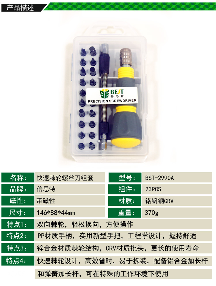 ? 产品名称: 23件套 快速棘轮螺丝刀组套? 产品型号: BST-2990A? 产品类别: 螺丝批系列