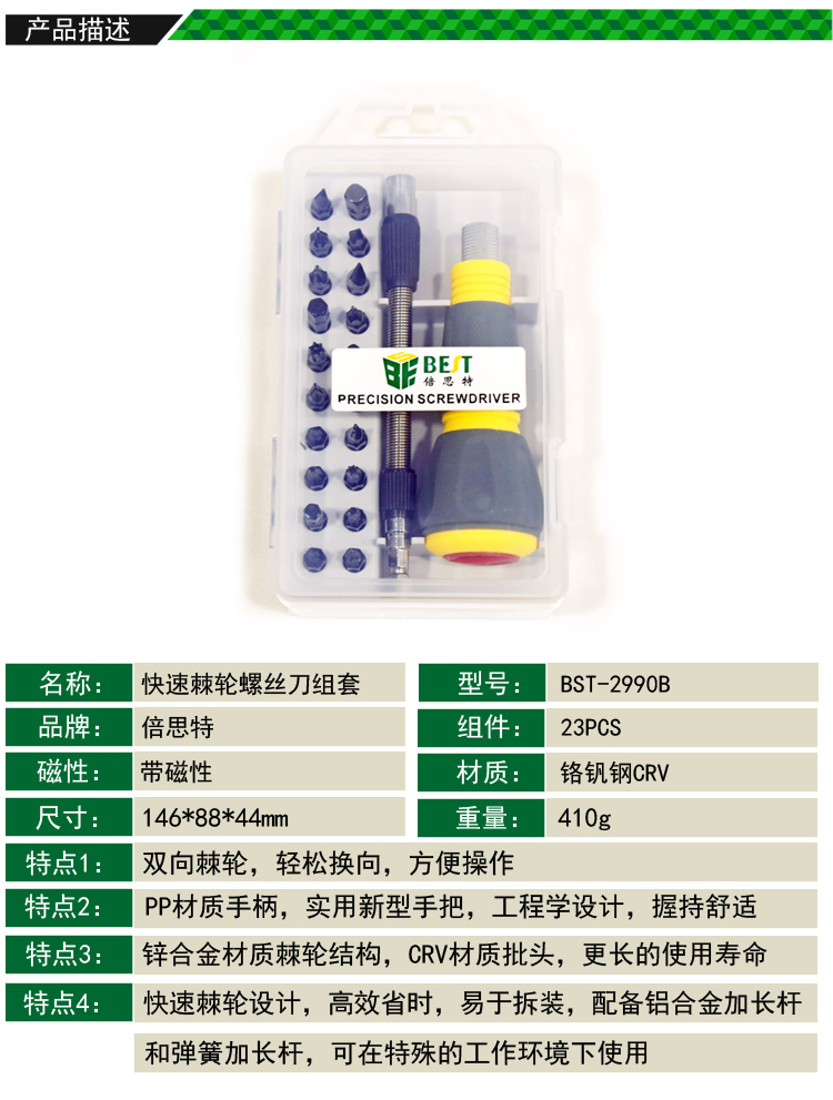 ? 产品名称: 23件套 快速棘轮螺丝刀组套? 产品型号: BST-2990B? 产品类别: 螺丝批系列