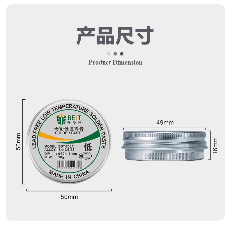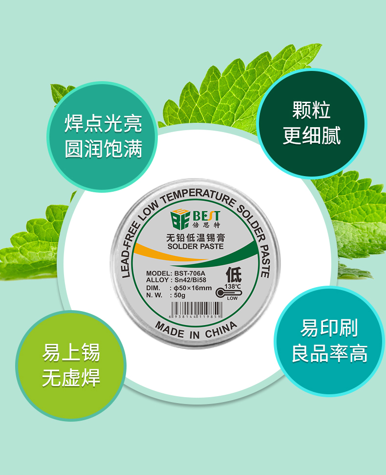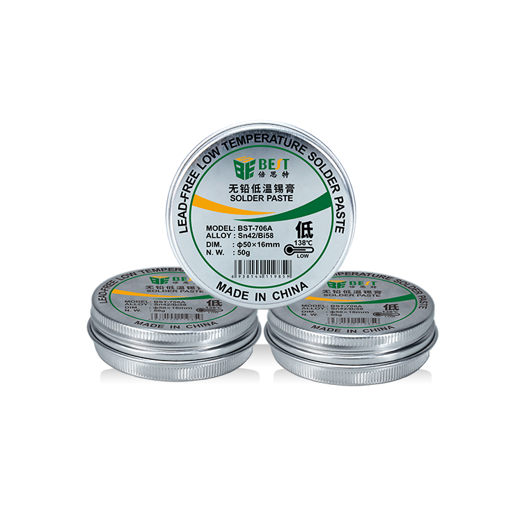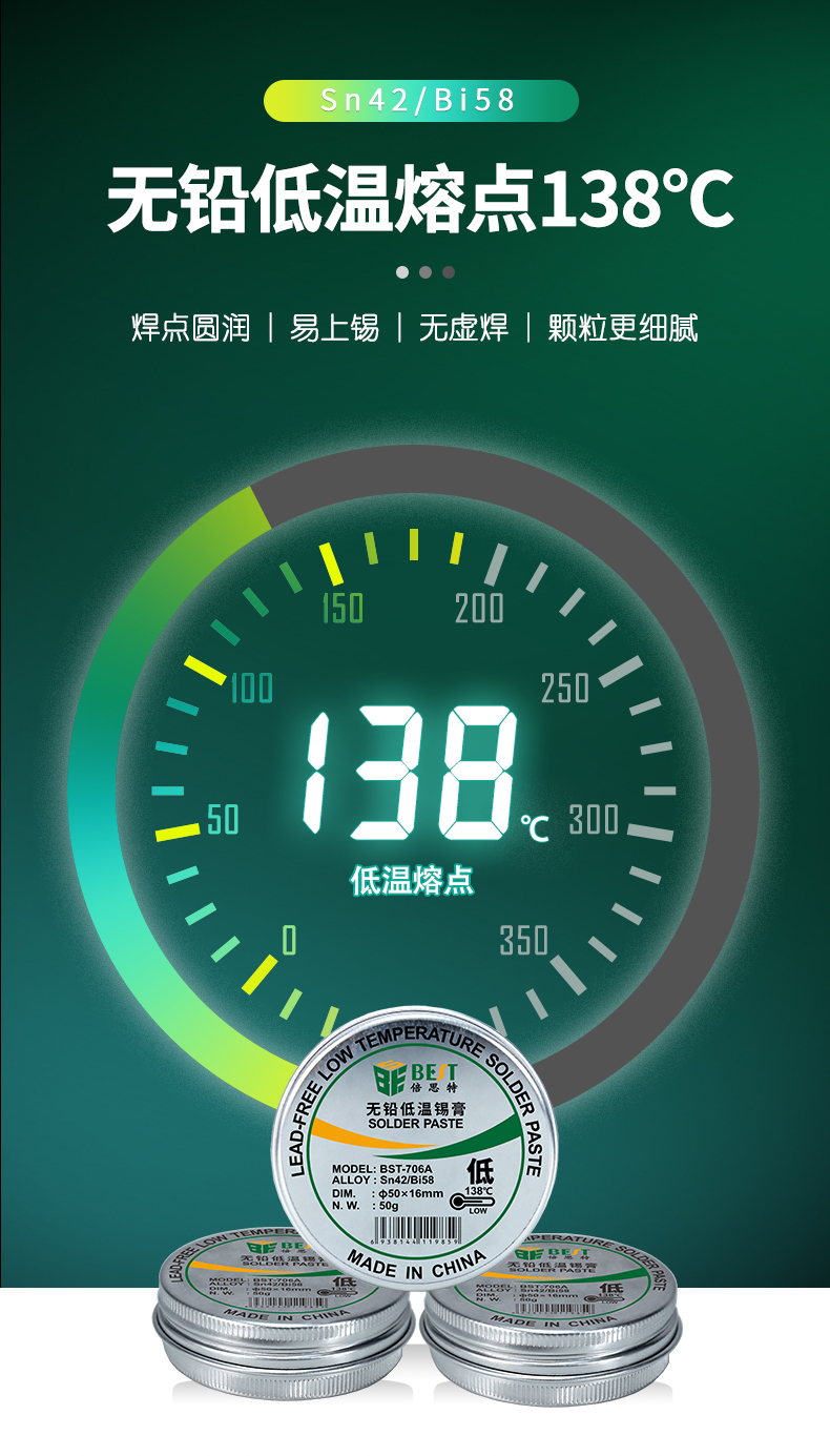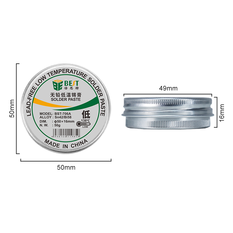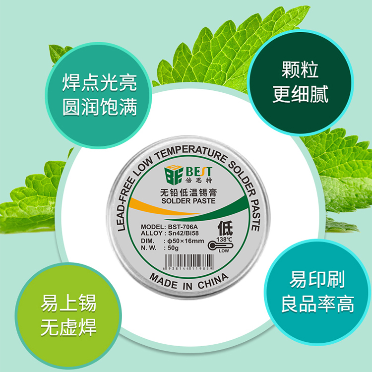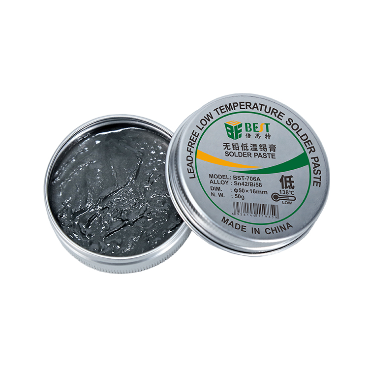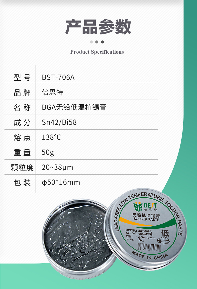 ? 产品名称: 无铅低温锡膏? 产品型号: BST-706A? 产品类别: 锡浆焊油系列? 产品成分: Sn42/Bi58? 产品重量: 50g