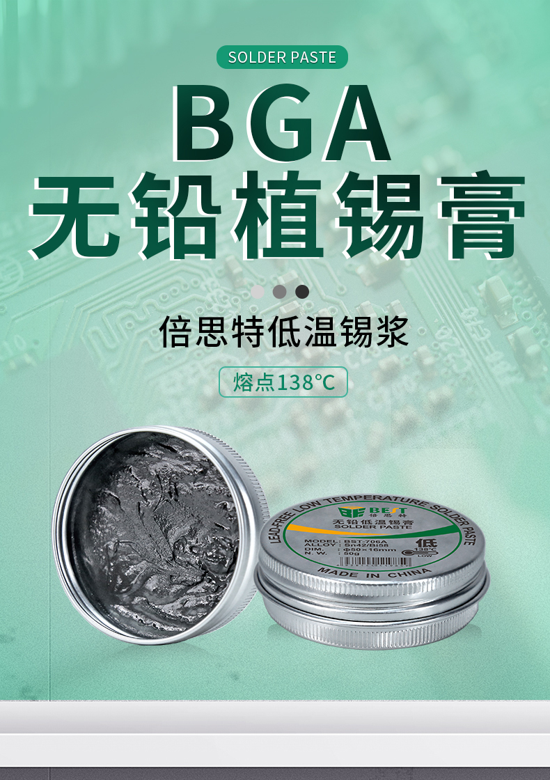 返回当前位置: 首页 / 产品中心 / BST-706A 无铅低温锡膏 Sn42/Bi58 铝罐BGA植锡膏50g