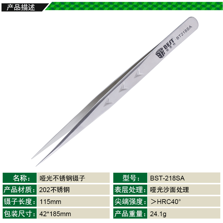 ? 产品名称: 亚光沙面镊子 不锈钢镊子? 产品型号: BST-218SA? 产品类别: 镊子系列