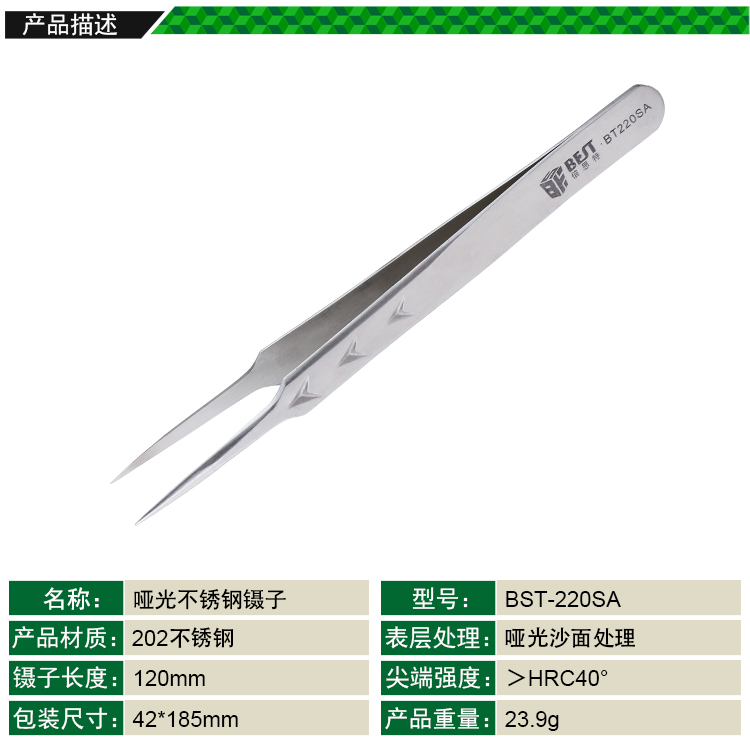 ? 产品名称: 亚光沙面镊子 不锈钢镊子? 产品型号: BST-220SA? 产品类别: 镊子系列
