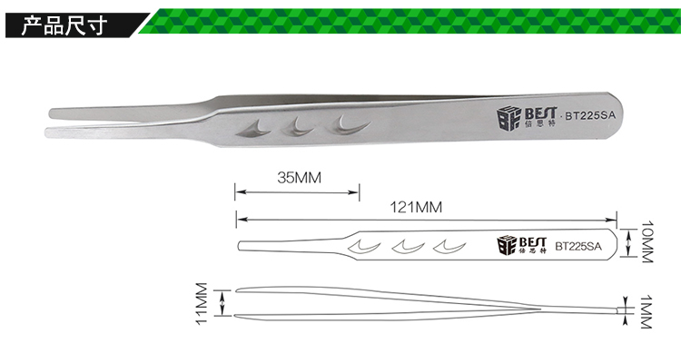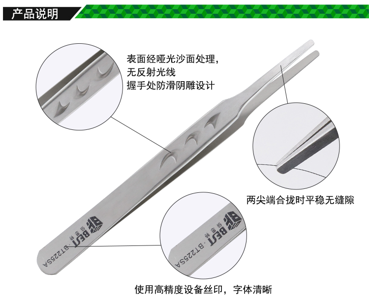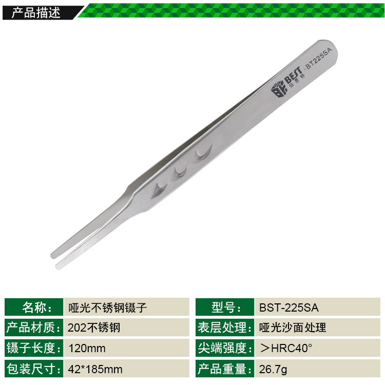 ? 产品名称: 亚光沙面镊子 不锈钢镊子? 产品型号: BST-225SA? 产品类别: 镊子系列