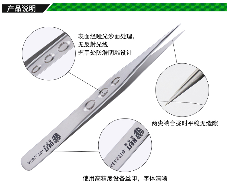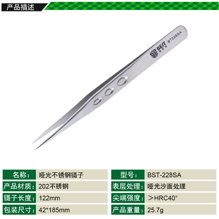 ? 产品名称: 亚光沙面镊子 不锈钢镊子? 产品型号: BST-228SA? 产品类别: 镊子系列