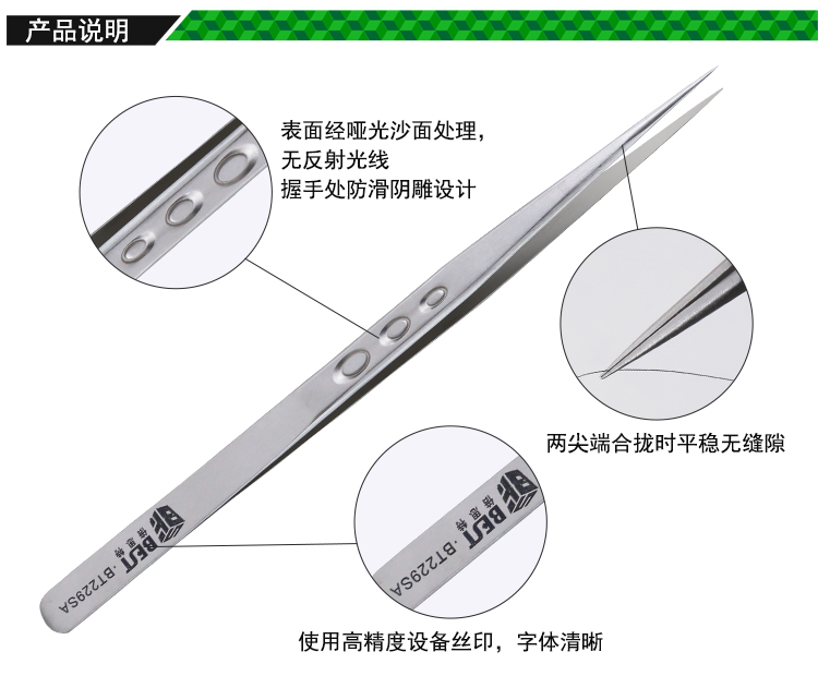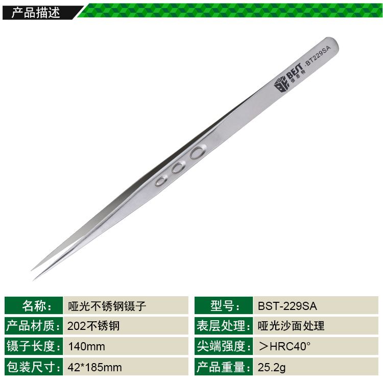? 产品名称: 亚光沙面镊子 不锈钢镊子? 产品型号: BST-229SA? 产品类别: 镊子系列