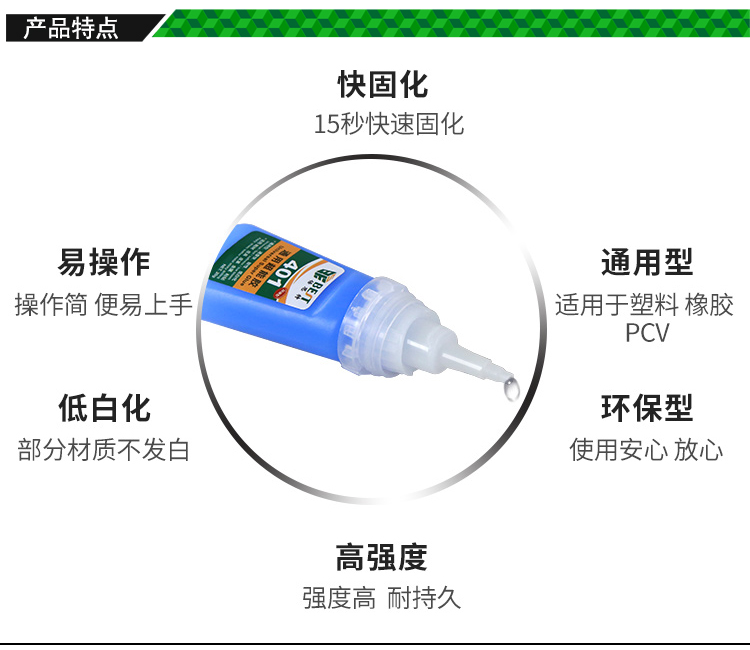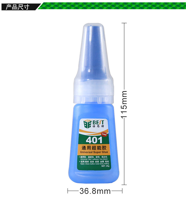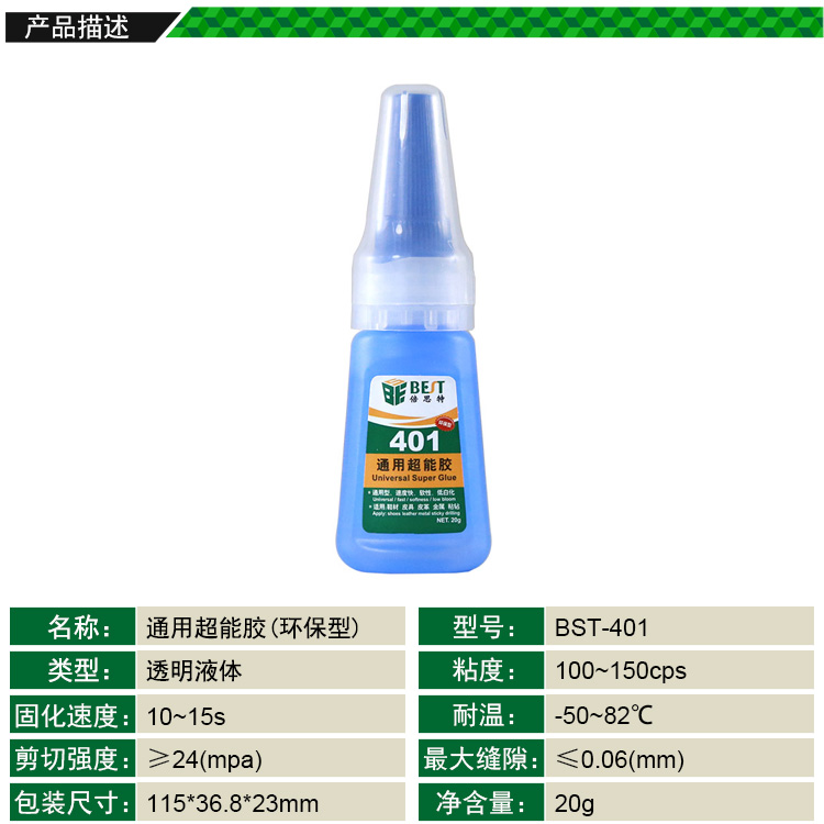 ? 产品名称: 通用超能胶 瞬间胶(环保型)? 产品型号: BST-401? 产品类别: 胶水胶纸系列