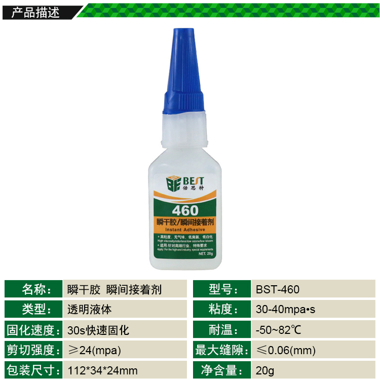 ? 产品名称: 瞬干胶 瞬间接着剂 瞬间胶? 产品型号: BST-460? 产品类别: 胶水胶纸系列