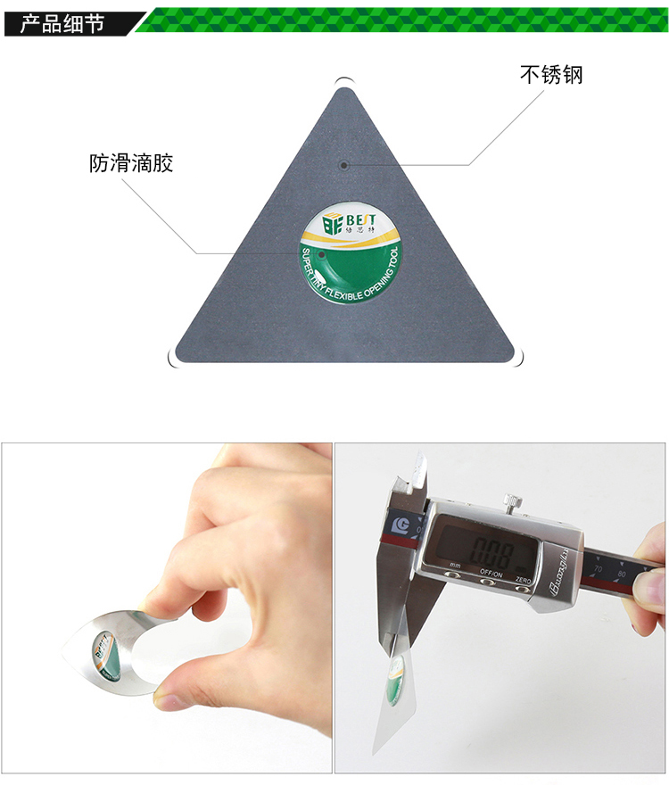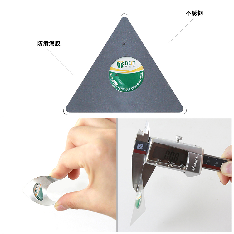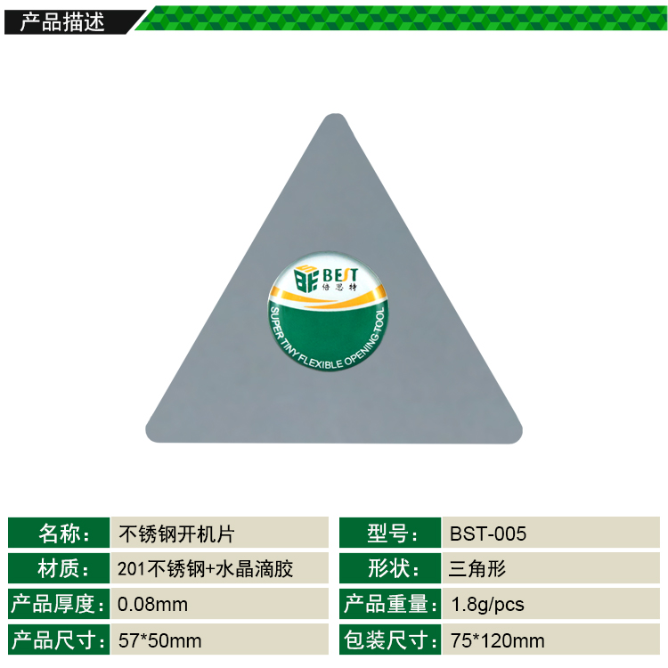 ? 产品名称: 不锈钢开机片(三角片)? 产品型号: BST-005? 产品类别: 撬棒撬片系列